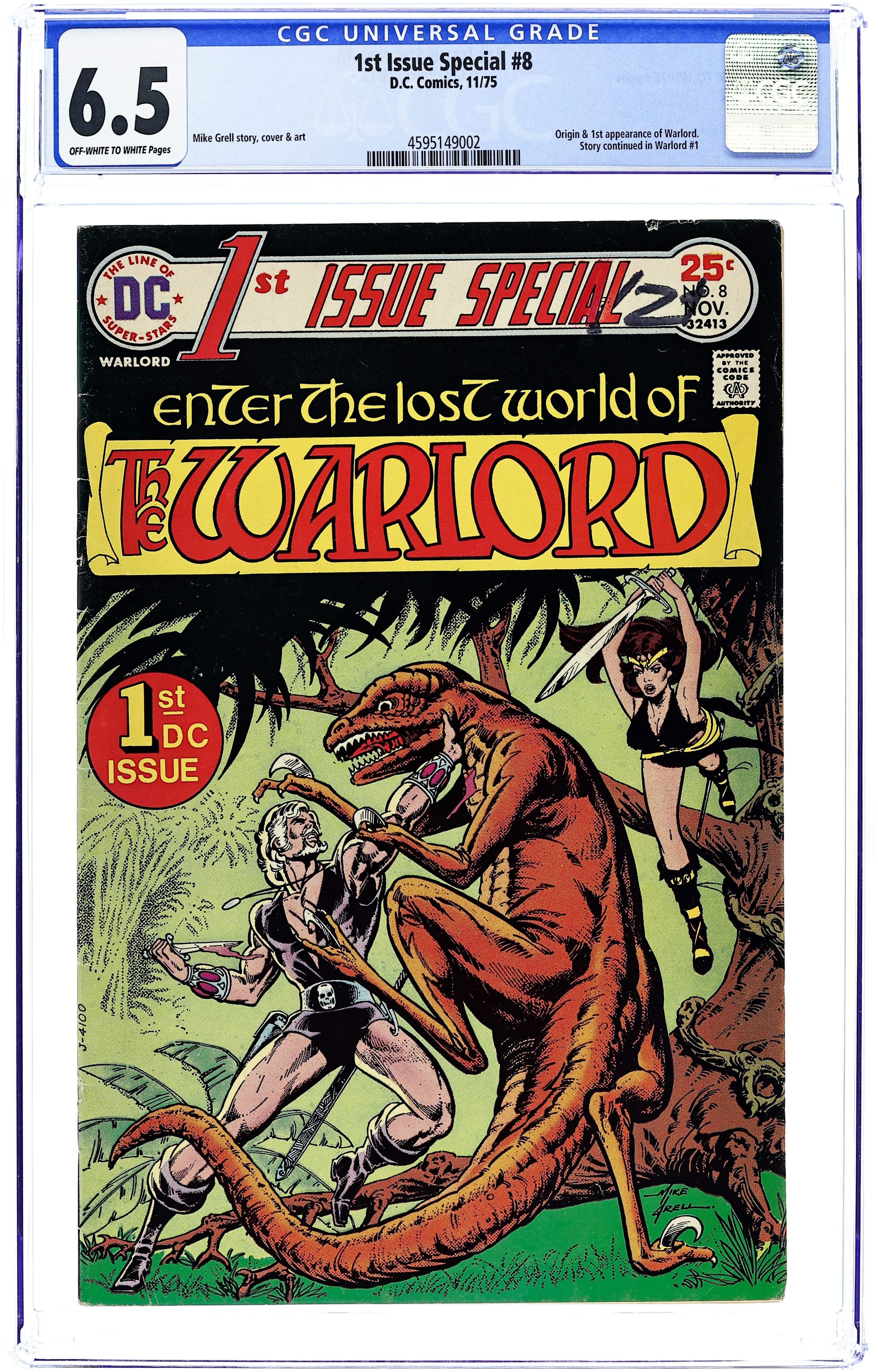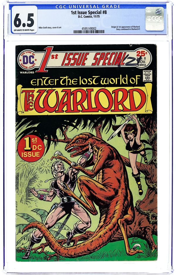 "Land of Fear!" A pilot finds himself in the subterranean world of Skartaris, where he rescues a girl and angers a high priest. 1st appearance of Travis "Warlord" Morgan. Script, art, and cover by Mike Grell. Cover price $0.25.