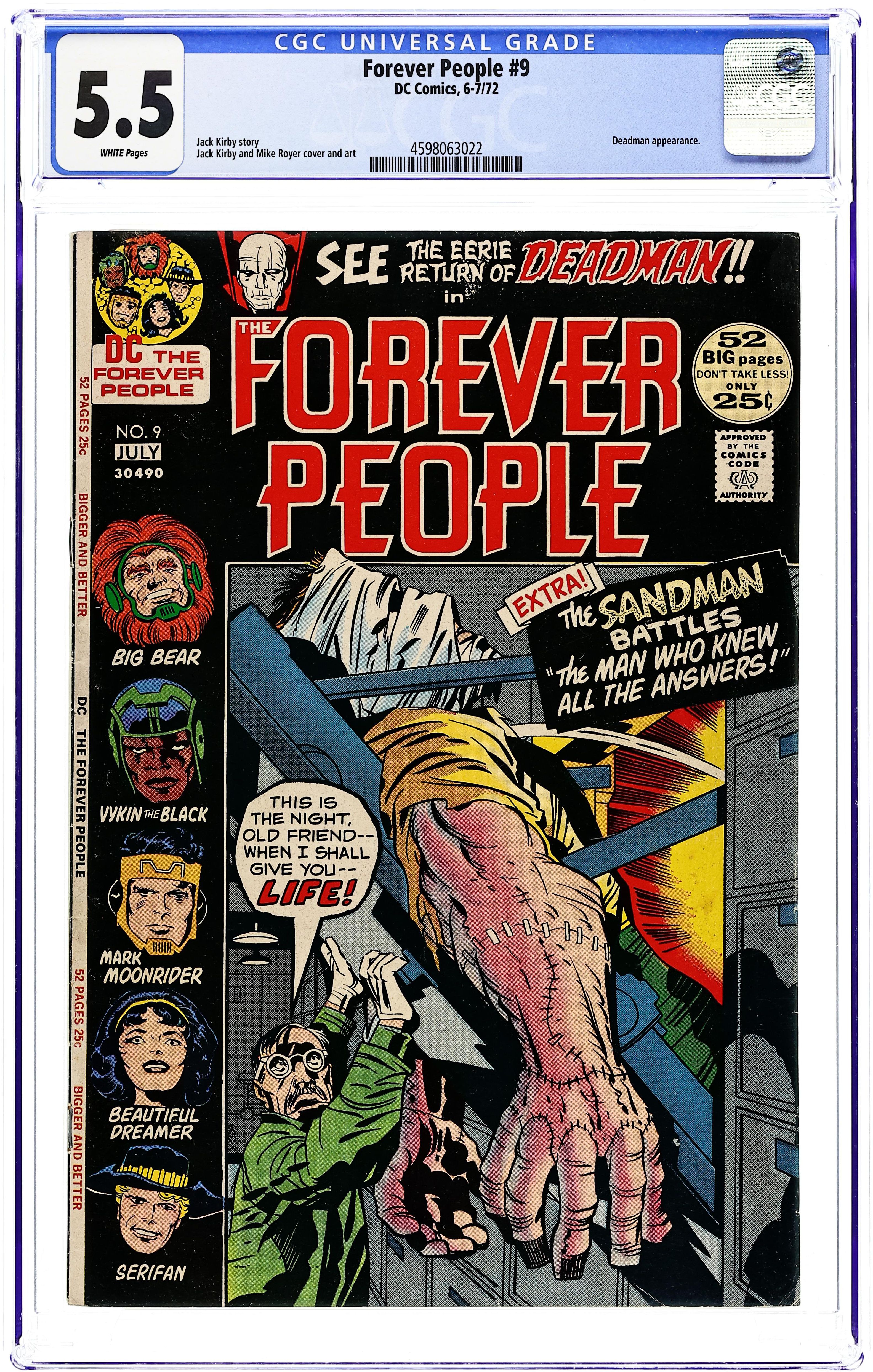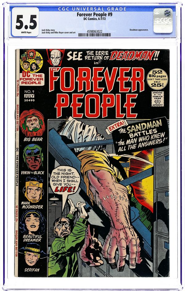 Cover pencils by Jack Kirby, inks by Mike Royer. Monster in the Morgue!, script and pencils by Jack Kirby, inks by Mike Royer; "Doc" Gideon steals one of Serafan's capsules to use it to re-animate a corpse made of assorted body parts; Deadman turns up at a séance and contacts the Forever People. Adventure Comics #74 with Sandman, pencils by Jack Kirby. The Man Who Knew All the Answers!, script and pencils by Jack Kirby; Sandman and Sandy face the threat of a scientist who has invented a machine whose revitalizing vibrations allow a man to develop his unused brain cells, tripling his thinking power! 48 pgs. $0.25. Cover price $0.25.