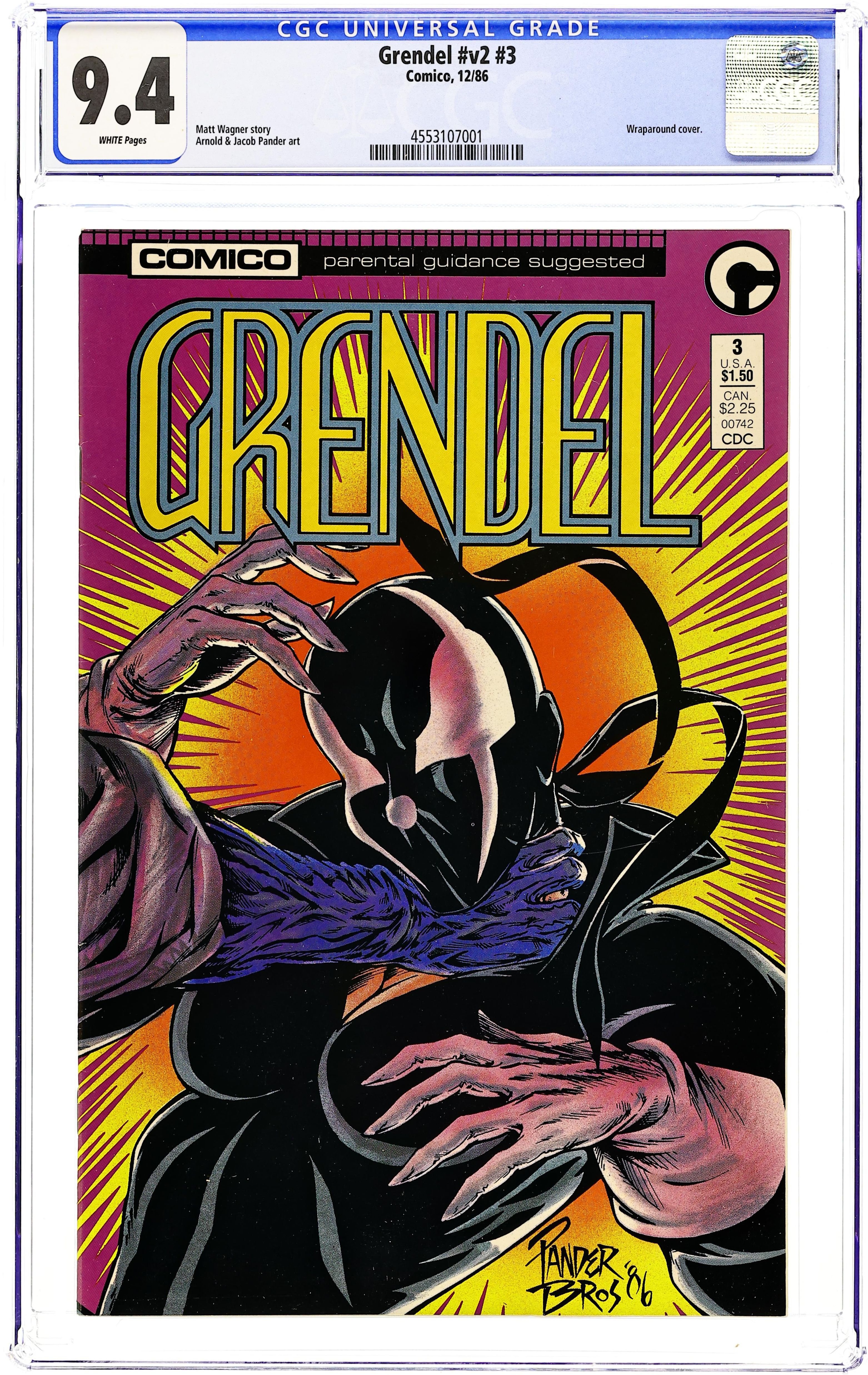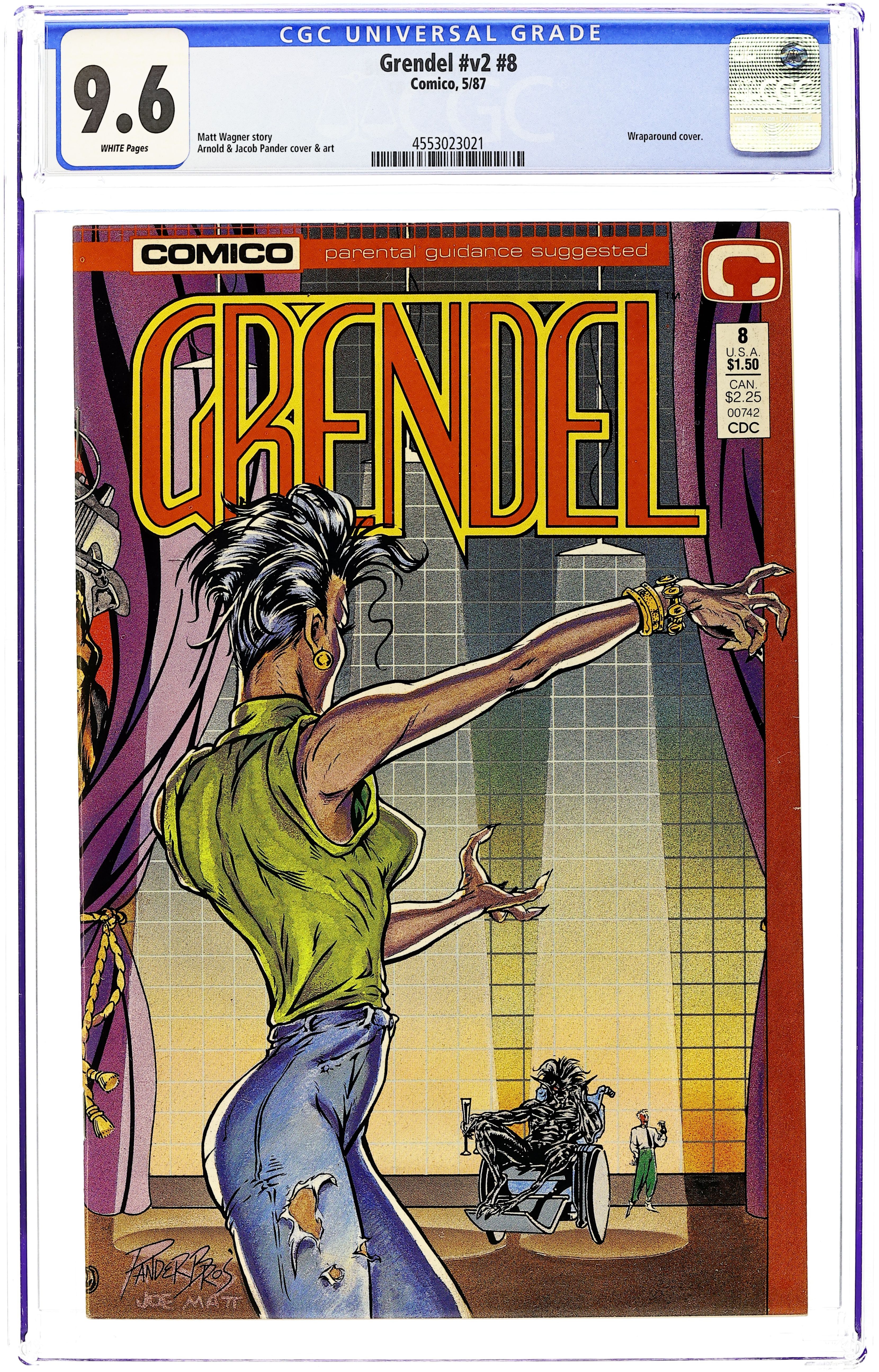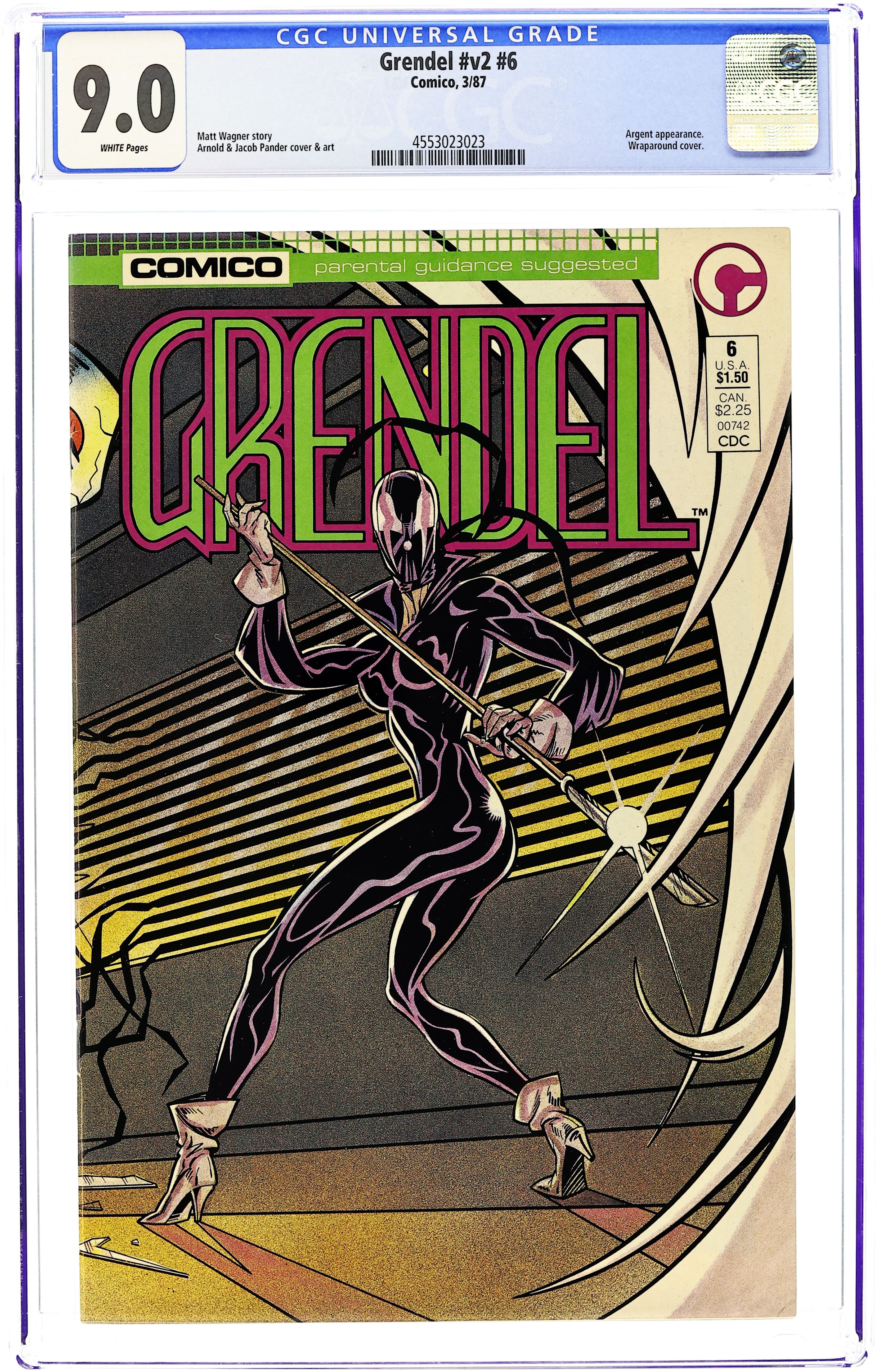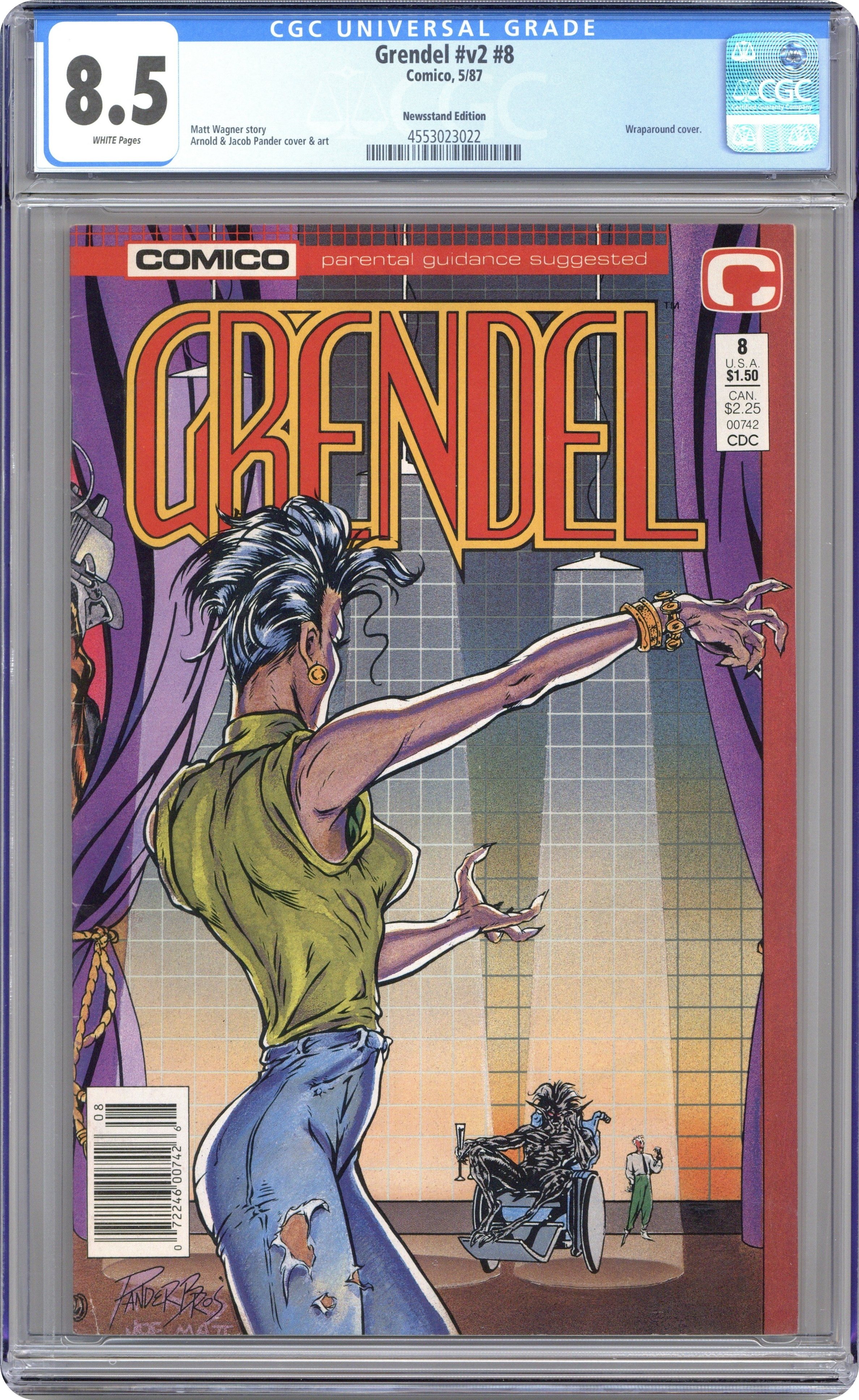 The trail to who kidnapped her son leads Grendel to some horrors and nightmares come to life in "Devil's Lash." Script by Matt Wagner and art by Arnold Pander, Jacob Pander & Rich Rankin. Wraparound cover. Cover price $1.50.