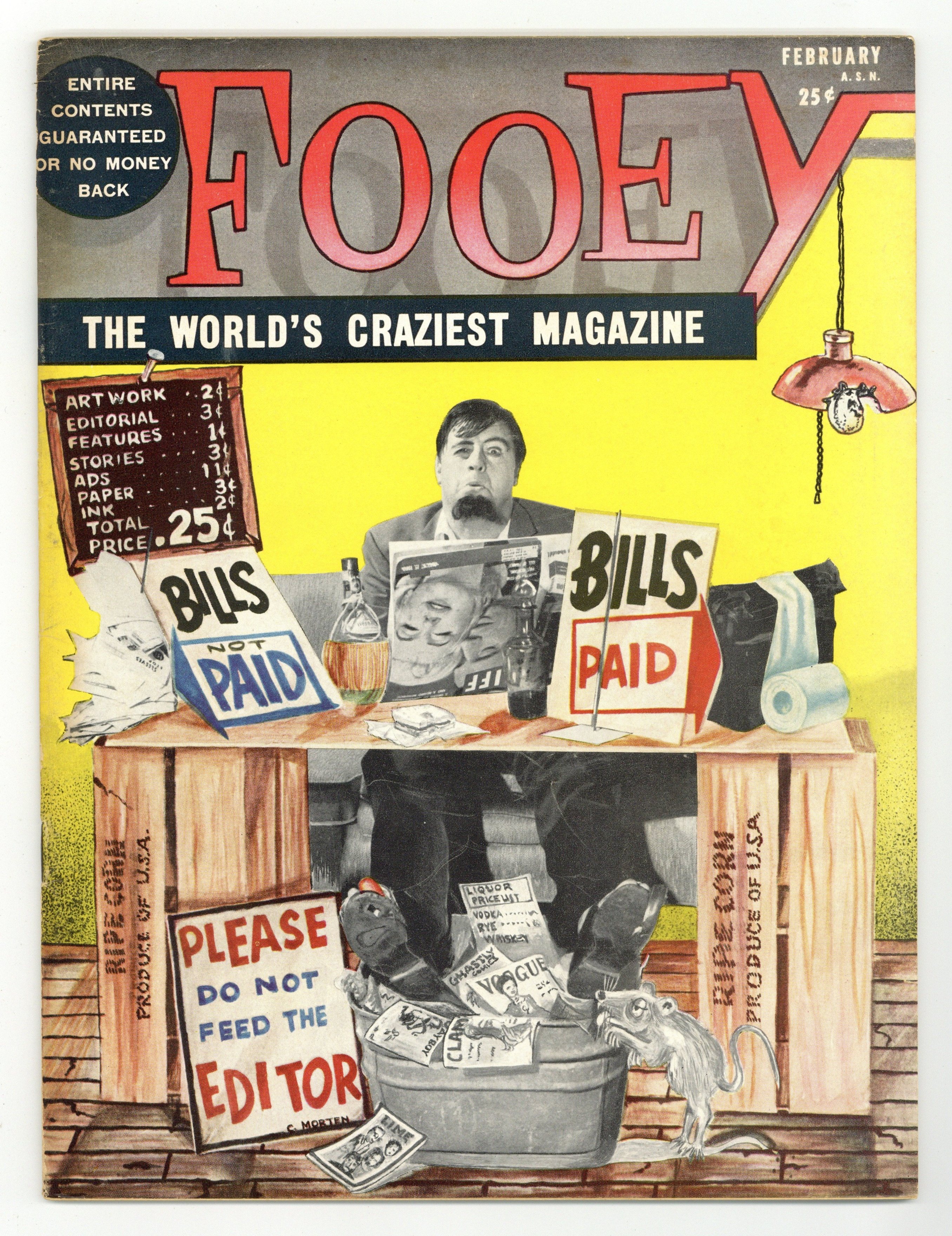 Fooey: The World's Craziest Magazine (1961) was published by Scoff Publishing. Fooey is a humor and satire magazine that even spoofs it's own ad space. Also included are the articles "I Struggled For Success", "Advice to the Loveworm", "Professor Mystic's Horroscope", and many more. 52 pages, color cover with black and white photos and illustrations in the interior, 8-in x 10.75-in. Cover price $0.25.