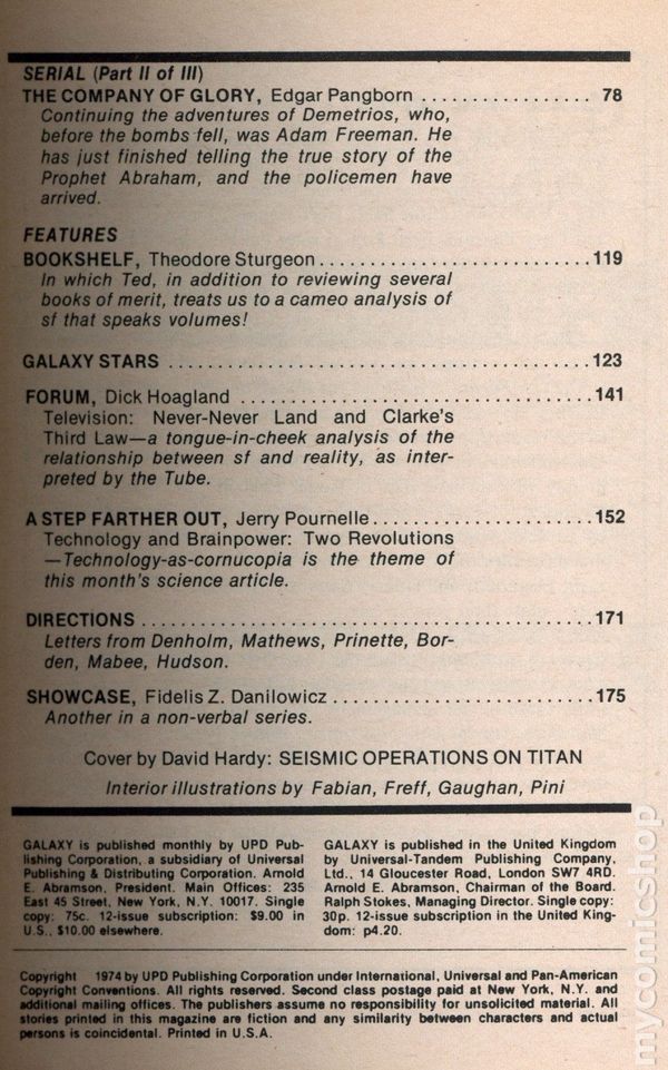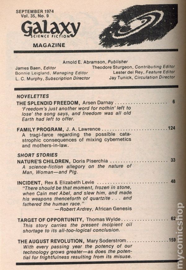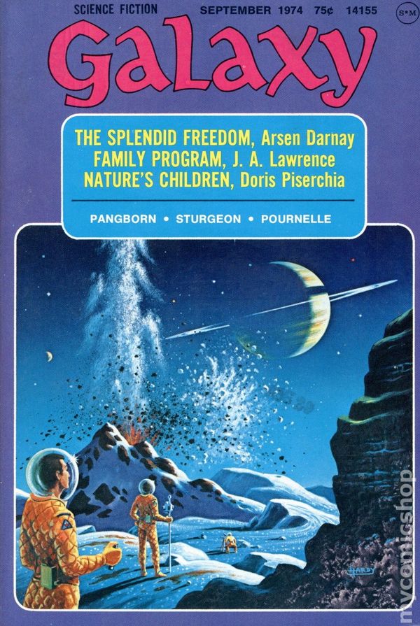 UK Edition. Issue 21 - September 1974. Cover by David Hardy. Science Fiction Stories: "The Splendid Freedom" by Arsen Darnay, "Family Program" by J.A. Lawrence, "Nature's Children" by Doris Piserchia, "Incident" by Rex and Elizabeth Levie, "Target of Opportunity" by Thomas Wylde, "The August Revolution" by Mary Soderstrom, and "The Company of Glory" (Part 2 of 3) by Edgar Pangborn.