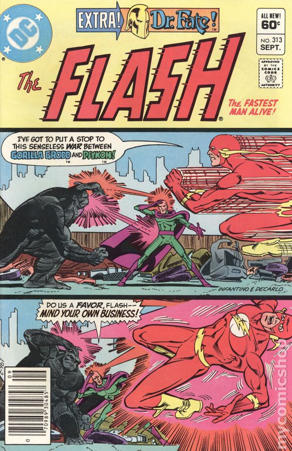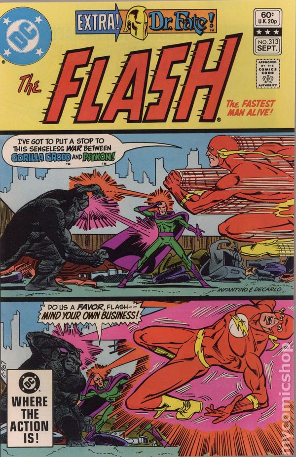 Direct Edition. Cover pencils by Carmine Infantino, inks by Mike DeCarlo. 3-Way Fight For a Super-Simian, script by Mike W. Barr, pencils by Carmine Infantino, inks by Dennis Jensen; A mysterious spiritual being named Psykon takes possession of a homeless man and takes on Flash and Gorilla Grodd. Crimson Testament, script by Steve Gerber and Martin Pasko, pencils by Keith Giffen, inks by Larry Mahlstedt; Dr. Fate must face renegade lord of order Ynar, who uses a crimson gem to transform the landscape and people into hideous forms. SGT Rock toy ad from Remco, art by Joe Kubert. Dungeons and Dragons Basic and Expert Sets ad. 36 Pages, Full Color. Cover price $0.60.