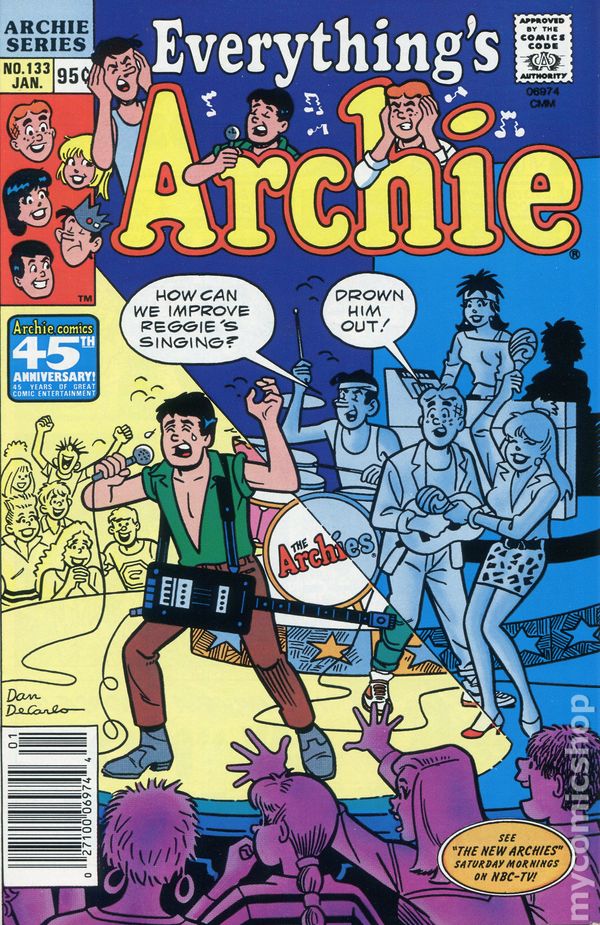 Canadian Price Variant. 95¢ cover price. Cover pencils by Dan DeCarlo. "You Don't Need Drugs" public service announcement with Archie. "Three Fates," script by Rich Margopoulus, pencils by Gene Colan, inks by Jon D'Agostino; While hang gliding, Archie is blown off course through the city and his appearance changes the lives of three spectators. Archie's Club News. Wait! I Know! activity page; Archie game with numbers and letters. "Young at Heart," script by George Gladir, pencils by Stan Goldberg, inks by Rudy Lapick; Betty and Veronica volunteer at a home for the elderly. "Rain Man," script by Frank Doyle, pencils by Dan DeCarlo, inks by Jim DeCarlo; Reggie attempts to invent the umbrella. "The Chess Master," script by Jim Ruth, pencils by Nate Butler, inks by Jon D'Agostino; Archie can't stay quiet while Mr. Lodge plays his weekly chess game against Mr. Bishop. 36 pages, full color.
