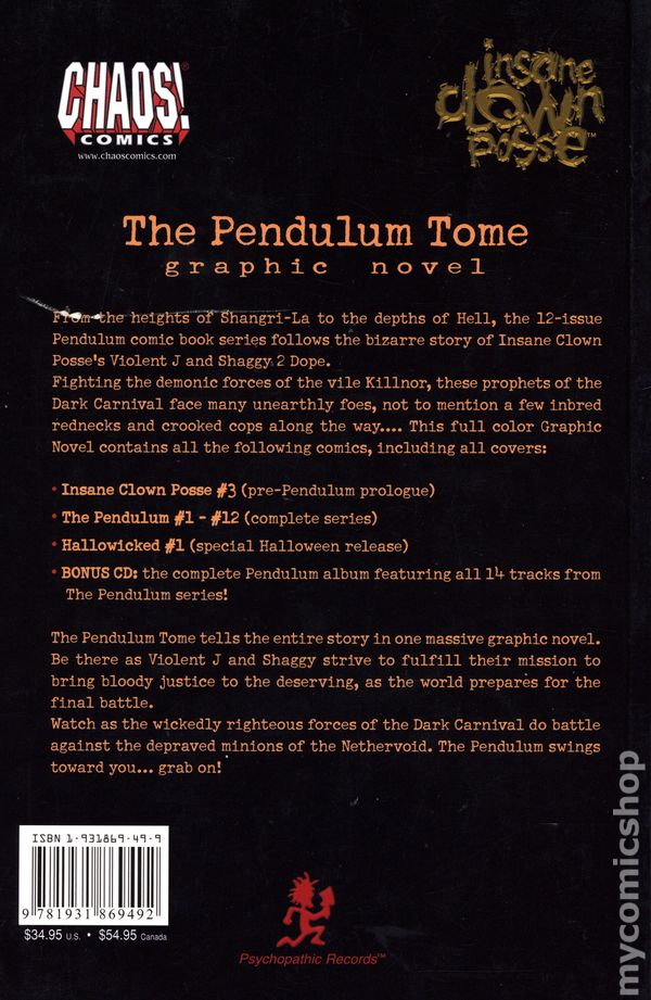 1st printing - Includes Bonus CD. Collects Insane Clown Posse (1999) #3, Insane Clown Posse The Pendulum (2000 Chaos) 1-12, and Insane Clown Posse Hallowicked (2001 Chaos) #1. Written by Jesse McCann and Jumpsteady. Art by Jerry Beck, Gerardo Sandoval, and Sandu Florea. Join the Prophets of the Dark Carnival, Violent J, and Shaggy 2 Dope, The Insane Clown Posse, in fighting the demonic forces of the vile Killnor! The Pendulum Tome tells the entire story of the forces of the Dark Carnival strive to bring justice to the deserving, facing many unearthly foes, demonic rappers, inbred rednecks, and crooked cops along the way! Softcover, 450 pages, full color. MATURE READERS. Cover price $34.99.