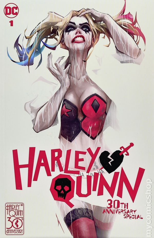 Cover by Stanley Artgerm Lau. Written by Amanda Conner, Jimmy Palmiotti, Paul Dini, Rafael Scavone, Sam Humphries, Stjepan Sejic, Rob Williams, Stephanie Phillips, Cecil Castellucci, Kami Garcia, Mindy Lee and Terry Dodson. Art by Chad Hardin, Guillem March, Rafael Albuquerque, Erica Henderson, Stjepan Sejic, John Timms, Riley Rossmo, Dan Hipp, Mico Suayan, Jason Badower, Terry Dodson and Rachel Dodson. You are cordially invited to an oversize extravaganza celebrating the Clown Princess of Crime's 30th birthday in this fantabulous special! That's right -- Harley Quinn turns 30 in absolute style and has invited a squad of her old creative pals to join her with a killer lineup of amazing stories! And the reviews are in -- it's guaranteed AWESOME: "Last chance, Quinn. Don't make me do this." —Amanda Waller. "Wait...you're not going back to..." —Red Tool. "Sigh." —Poison Ivy. Featuring: "Uncommon Bonds" by Amanda Conner, Jimmy Palmiotti and Chad Hardin; "Siren Soiree" by Paul Dini and Guillem March; "Cease and Decease" by Rafael Scavone and Rafael Albuquerque; "A Legend Is Born" by Sam Humphries and Erica Henderson; "Submissive" by Stjepan Sejic; "The Last Harley Story" by Rob Williams and John Timms; "How to Train Your Hyena" by Stephanie Phillips and Riley Rossmo; "Troop Harley Quinn" by Cecil Castellucci and Dan Hipp; "Criminal Sanity" by Kami Garcia, Mico Suayan and Jason Badower; and "Harley's World" by Mindy Lee, Terry Dodson and Rachel Dodson. 96 pages, full color. Ages 13+ Cover price $9.99.
