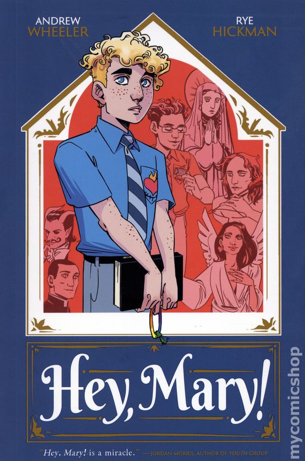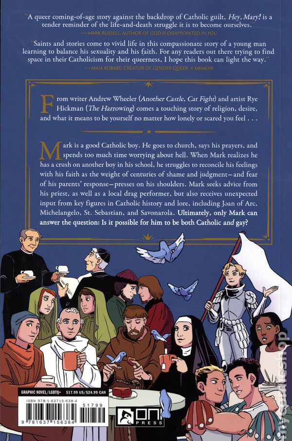 1st printing. Written by Andrew Wheeler. Art and cover by Rye Hickman. From writer Andrew Wheeler (Another Castle, Cat Fight) and artist Rye Hickman (The Harrowing) comes a touching story of religion, desire, and what it means to be yourself no matter how lonely or scared you feel. Mark is a good Catholic boy. He goes to church, says his prayers, and spends too much time worrying about hell. When Mark realizes he has a crush on another boy in his school, he struggles to reconcile his feelings with his faith as the weight of centuries of shame and judgment—and his fear of his parents response—presses on his shoulders. Mark seeks advice from his priest, as well as a local drag performer, but also receives unexpected input from key figures in Catholic history and lore, including Joan of Arc, Michelangelo, St. Sebastian, and Savonarola. Ultimately, only Mark can answer the question: Is it possible for him to be both Catholic and gay? Softcover, 6-in. x 9-in., 128 page, full color. Teen Cover price $17.99.