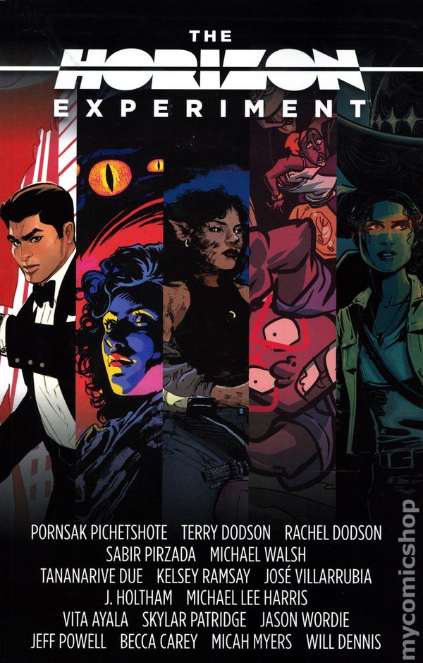 1st printing. Collects Horizon Experiment: Moon Dogs (2024 Image), Finders Keepers (2025 Image) Horizon Experiment, Manchurian (2024 Image) Horizon Experiment, and Sacred Damned: The Horizon Experiment (2024 Image). Written by Pornsak Pichetshote, Sabir Pirzada, Tananarive Due, J. Holtham, and Vita Ayala. Art and cover by Terry Dodson, Rachel Dodson, Michael Walsh, Kelsey Ramsay, Michael Lee Harris, Skylar Patridge. A comics anthology that puts a new spin on popular genres and pop culture icons. THE HORIZON EXPERIMENT collects five one-shots by some of the most celebrated names in comics, literature, TV, and film, providing pilots for new series featuring a Chinese James Bond, a Muslim exorcist, a reverse Indiana Jones, East African werewolves living in Miami, and an Evil Dead for black nerds. Softcover, 160 pages, full color. Mature Readers Cover price $16.99.