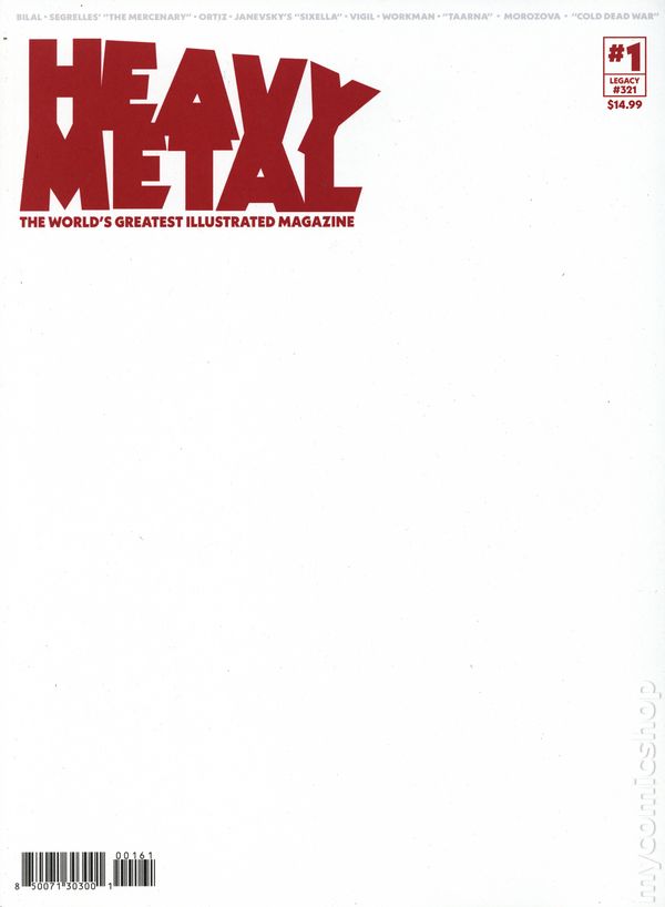 Written and Art by Enki Bilal & Various. Blank Cover. Heavy Metal magazine is back! Heavier than ever! This relaunch brings the world's greatest illustrated magazine back to the forefront of comics. One of the magazine's original legends, Enki Bilal returns with his acclaimed BUG series. Burton & Cyb returns by Antonio Segura and Jose Ortiz, as well as Vicente Segrelles' The Mercenary. HM will debut Janevsky's cult sci-fi heroine, Sixella. Guido Crepax' classic character Valentina returns by Sergio Gerasi. Writing duo Leah Moore and John Reppion will pen Taarna's ongoing adventures, with art from Anna Morozova. Also featuring: Cold Dead War (B-17) by Craig Wilson, Grimaldi by Keron Grant, and Legends of Taarna by Joseph Michael Linsner. Fernando Dagnino brings Lester, That Old Feeling. The return of classic strips The Bus by Paul Kirchner and June 2050 by John Workman. Michael Conrad will pen a top-secret saga TBA. Visionary creators David Quinn and Tim Vigil deliver Transcendestiny. 230 pages, PC/B&W. Rated M Cover price $14.99.