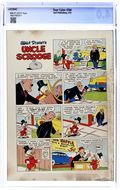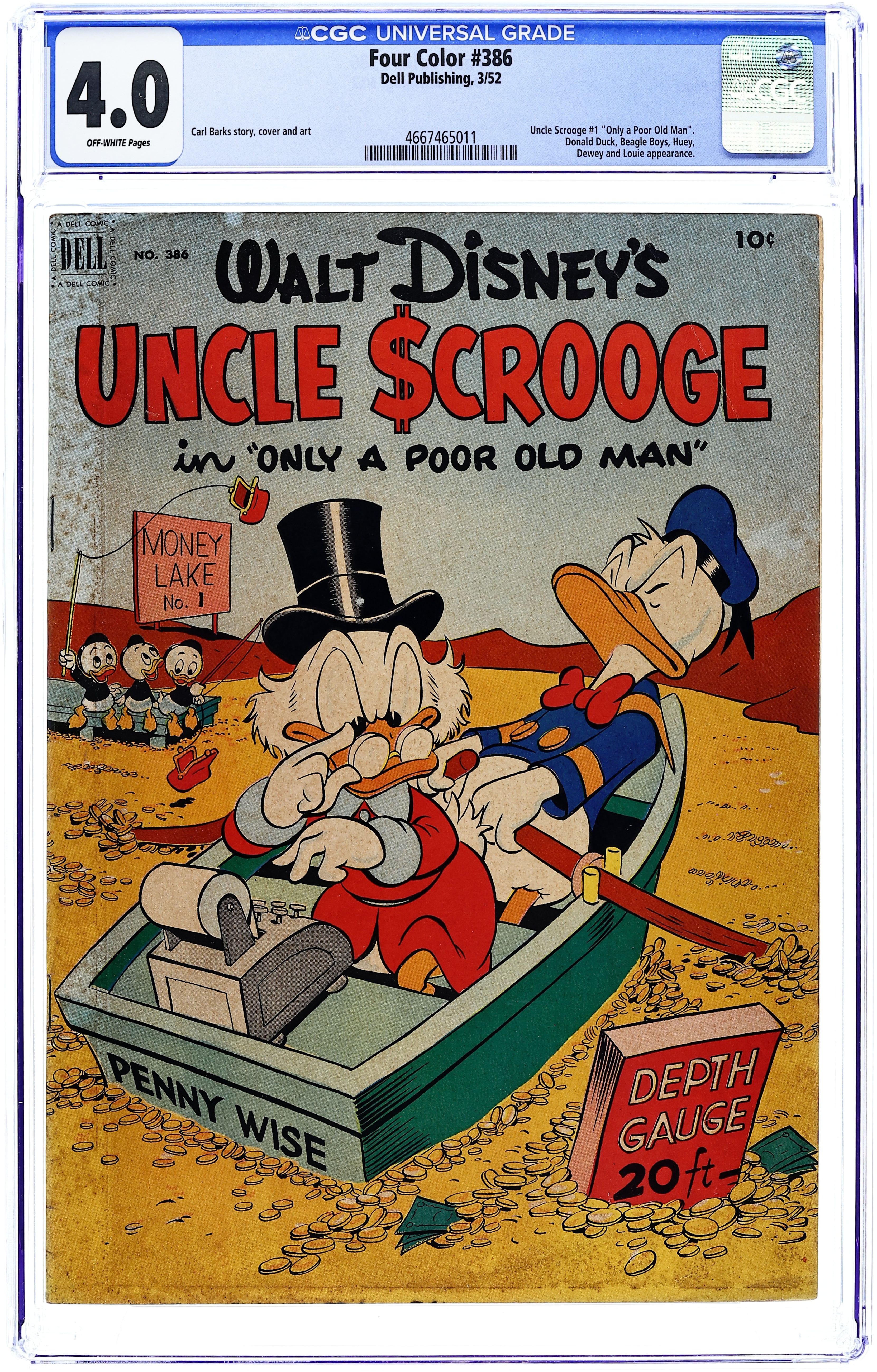 Cover art by Carl Barks. Only a Poor Old Man; When the Beagle Boys erect a building next to Scrooge's money bin, with plans to puncture the bin and drain out the money, Scrooge secretly transfers his money to an old reservoir, where he hides it underwater; Learning of this stratagem, the Beagle Boys try to destroy a dam so that Scrooge's money will flow onto their land. Coffee for Two; Scrooge takes a bum to a diner for a "free" cup of coffee. Soupline Eight back cover strip; Scrooge decides to "take a chance" on the Soupline Eight car. Scripts and art by Carl Barks. 36 pages, full color. Cover price $0.10.