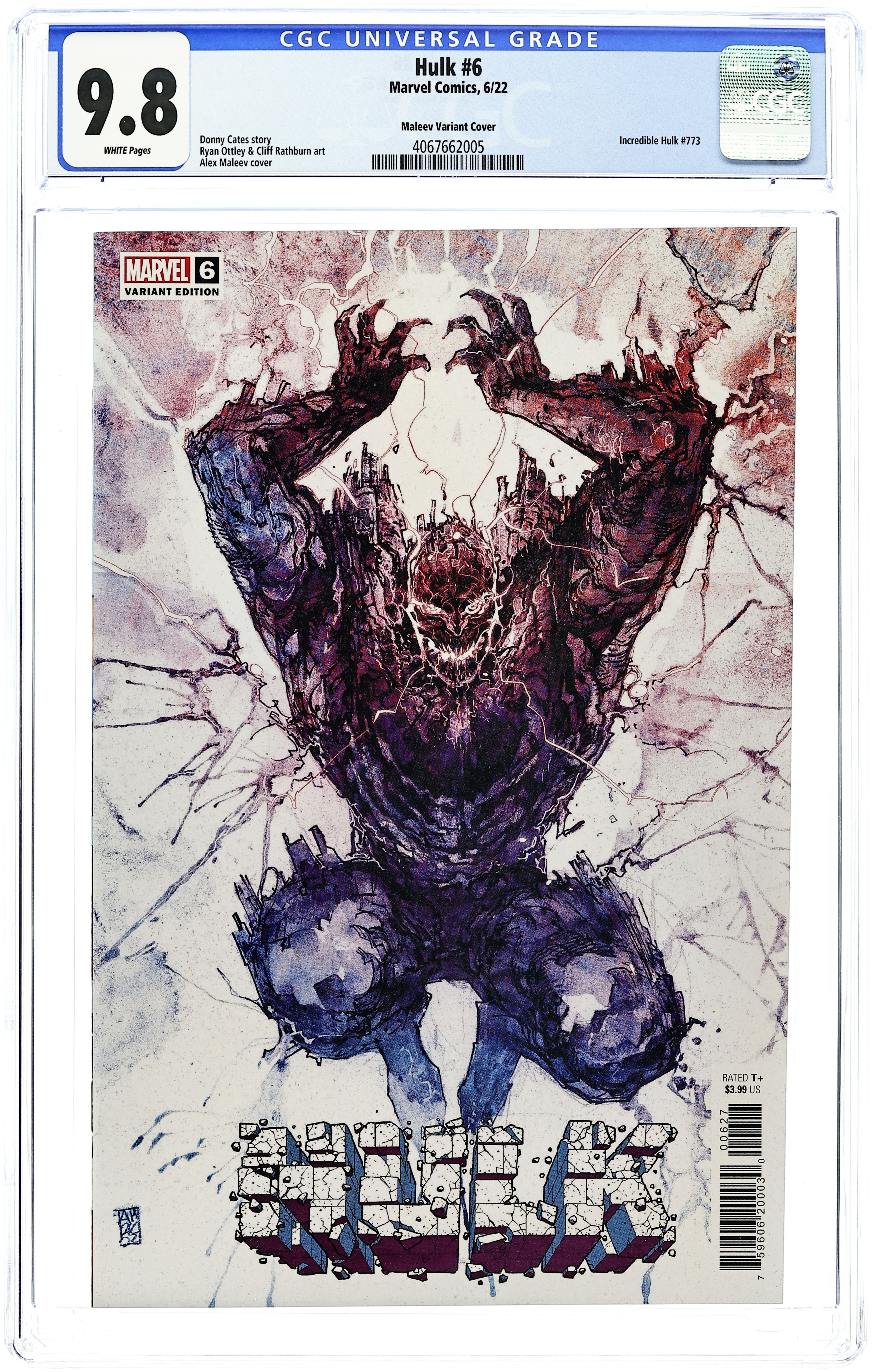 Limited 1 for 200 Retailer Incentive Variant Cover. Written by Donny Cates. Art by Ryan Ottley. Cover by Alex Maleev; UNASSIGNED. "SMASHTRONAUT" Part 6 of 6! The first arc of Donny Cates and Ryan Ottley's mind-blowing Hulk saga reaches its epic climax as Bruce Banner's control over Starship Hulk slips…and something much worse takes the wheel… 28 pages, full color. Rated T+ Cover price $3.99.