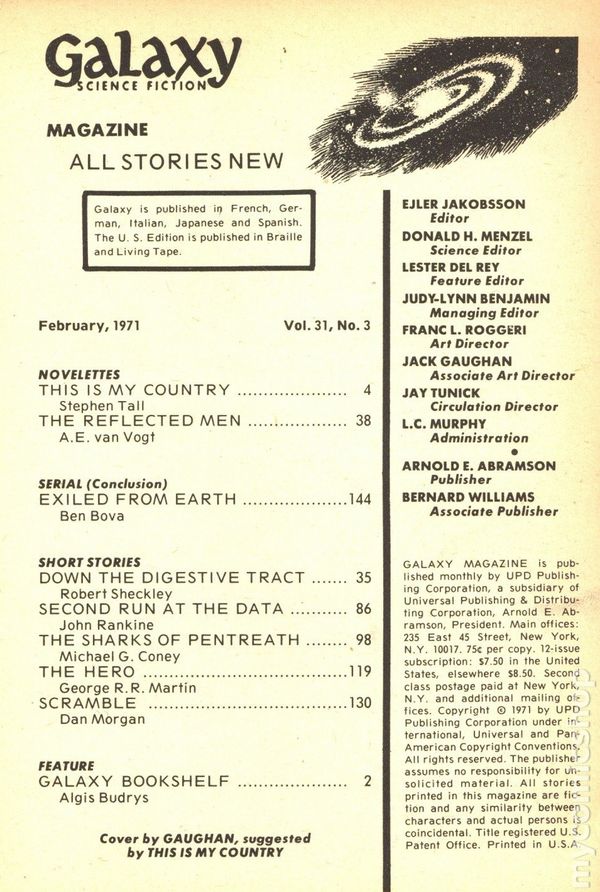 Cover by Jack Gaughan. "Hero" by George R. R. Martin (1st published work). Other science fiction stories by Stephen Tall, A. E. Van Vogt, Ben Bova, Robert Sheckley, John Rankine, Michael G. Conway, Dan Morgan. Illustrations by Gaughan, Rotsler. Softcover Pulp Digest, 5-in. x 7-in.; 192 Pages, B&W. Cover price $0.75.