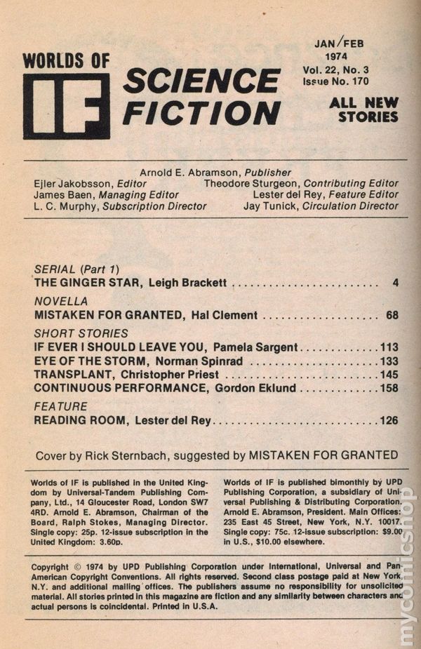 January-February 1974. Volume 22, No. 3 (Whole No. 170). Cover by Rick Sternbach. Science fiction stories by Leigh Brackett, Hal Clement, Pamela Sargent, Norman Spinrad, Christopher Priest, Gordon Eklund. 5.25-in. x 7.5-in.; black and white; 176 newsprint pages. Cover price $0.75.