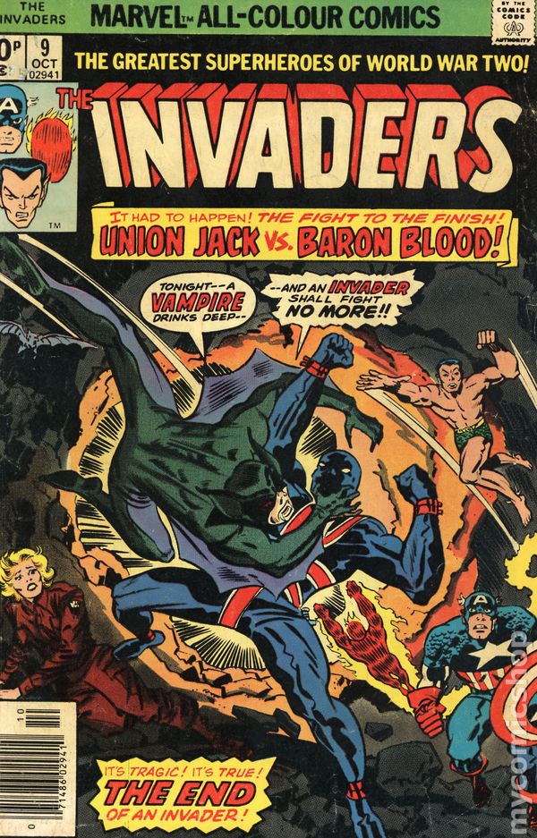 UK edition. Identical to US edition, but has 10p cover price. Part 3 of 3 - "An Invader No More!" Written by Roy Thomas. Art by Frank Robbins and Frank Springer. It's a battle to the death between the Invaders and Baron Blood, a vampire Nazi sympathizer. In this issue, an Invader shall fall. Don't miss the heart-pounding conclusion! 32 pages FC
