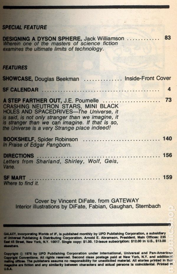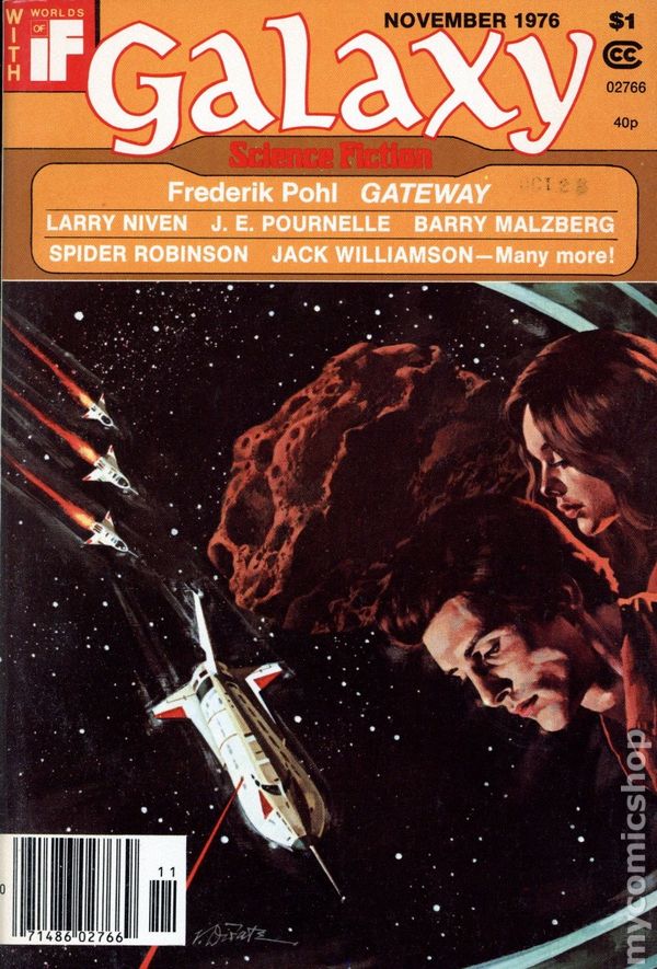 November 1976. Cover by Vincent Di Fate. Science fiction stories by Frederic Pohl, Larry Niven, Kevin O'Donnell Jr, Craig Strete, Thomas Wylde, Barry Malzberg, Bill Pronzini. Interior Illustrations by Di Fate, Fabian, Gaughan, Sternbach. Softcover Pulp Digest, 5-in x 7 1/2-in, 160 Pages, B&W. Cover price $1.00.