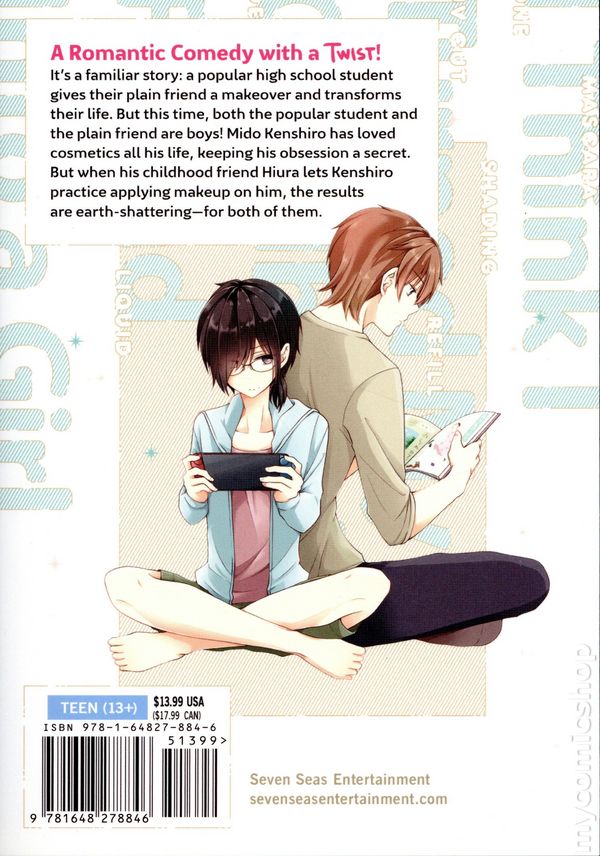 Volume 1 - 2nd and later printings. Story art, and cover by Azusa Banjo. Translated by Childhood Friend Translation Team. Its a familiar story: a popular high school student gives their plain friend a makeover and transforms their life. But this time, both the popular student and the plain friend are boys! Mido Kenshiro has loved cosmetics all his life, keeping his obsession a secret. But when his childhood friend Hiura lets Kenshiro practice applying makeup on him, the results are earth-shattering—for both of them! Softcover, 5-in. x 7-in., 164 pages, B&W. Teen NOTE: Seven Seas has reviewed and retranslated all reprints of this volume to more accurately depict the authors intent. Cover price $13.99.
