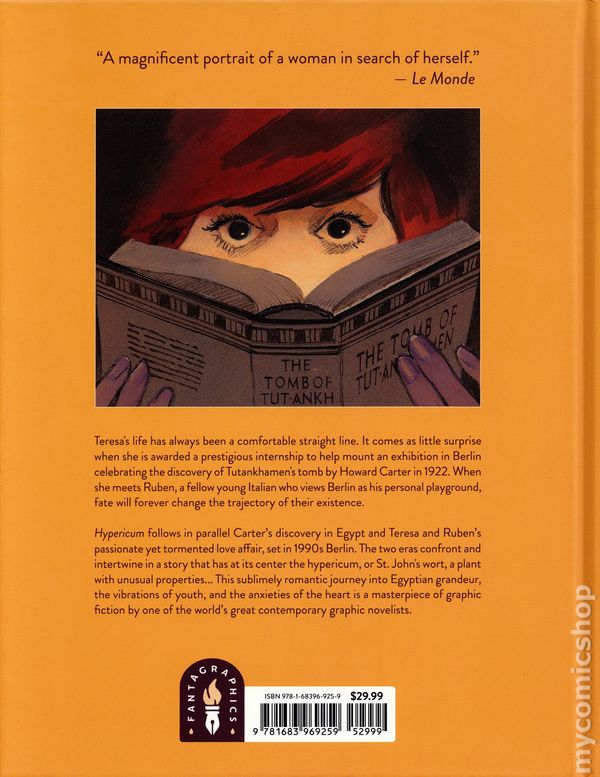 1st printing. Story and art by Manuele Fior. Teresa's life has always been a comfortable straight line, with every goal set for herself achieved right on schedule. It comes as little surprise when she wins a prestigious scholarship to help mount an exhibition in Berlin celebrating the discovery of Tutankhamen's tomb by Howard Carter in 1922. Ruben is a fellow young Italian who never finished his art studies and views Berlin as his personal playground. When Teresa and Ruben meet, fate will forever change the trajectory of their existence.Hypericum follows, in parallel, Carter's landmark 1920s discovery in Egypt and Teresa and Rubens passionate yet tormented love affair, set in 1990s Berlin. Between Egypt and Berlin, the two eras confront and intertwine in a story that has at its center the hypericum, or St. John's wort, a plant with unusual properties….This sublimely romantic journey into Egyptian grandeur, the vibrations of youth, and the anxieties of the heart is a masterpiece of graphic fiction by one of the worlds great contemporary graphic novelists, about how the strongest bonds are created by the passage of time. Hardcover, 9-in. x 12-in., 144 pages, full color. Mature Readers Cover price $29.99.