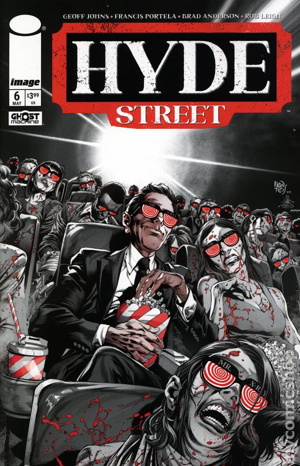 Written by Geoff Johns. Art by Francis Portela, Brad Anderson. Cover by Ivan Reis & Various. The manipulative Mr. X-Ray wants out of Hyde Street, pronto. The closer he gets to snatching 10,000 souls, the nearer his freedom. And he wants to up the count in a big way: by capturing an entire theater full of poor saps who have found their way onto Hyde Street. But will one good soul ruin it all? 32 pages, full color. Rated T+ Cover price $3.99.