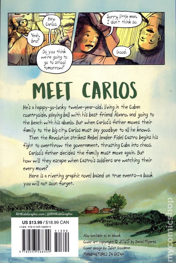 1st printing. Story and art by Daniel Miyares. Here is the dramatic coming-of-age memoir -- told in the form of a graphic novel -- of 12-year-old Carlos (who would grow up to become the authors father), his life during the Cuban Revolution, and his familys harrowing escape to America. The year is 1957. Carlos lives with his family in Ceiba Mocha, a small town in the Cuban countryside. He loves to play baseball with his best friend, Alvaro, and to shoot home-made slingshots with his abuelo. One day, a miracle happens: Carlos' father, his papi, wins the lottery! He uses the money to launch his growing furniture business and to move the family to a big house in the city. Carlos hates having to move -- hates leaving Abuelo and Alvaro behind -- and hates being called country kid at his new school. But the pains of moving and middle school turn out to be the least of his problems. When rebel leader Fidel Castro overthrows the existing Cuban president, the entire country is thrust into revolution. Then, suddenly, Papi disappears. Carlos' mother tells him that Papi has gone to America, and that their whole family will soon join him. But Carlos really doesn't want to leave Cuba, the only home he's ever known. Besides, how will they get to America when Castro's soldiers are policing their every move? Will Carlos ever see his father again? This powerful book about a boy coming of age amid massive political upheaval tells a timeless story of one family's quest for freedom and for a new place to call home. Softcover, 5 1/2-in. x 8 1/2-in., 240 pages, full color. Cover price $13.99.