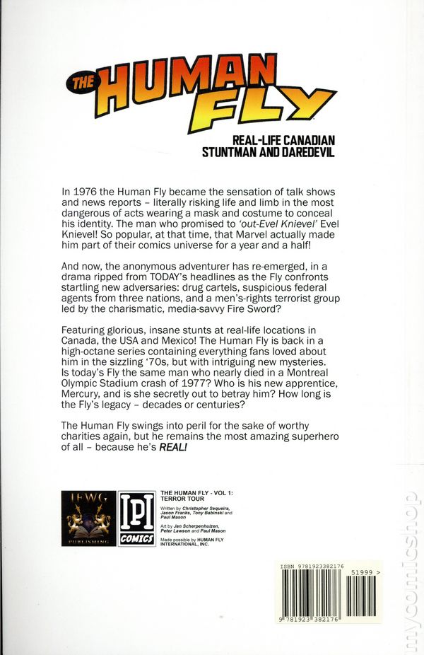 Volume 1 - 1st printing. "Terror Tour!" Collects The Human Fly (2024 IPI Comics) #0-4. Written by Christopher Sequeira, Jason Franks, Tony Babinski, and Paul Mason. Art by Jan Scherpenhuizen, Peter Lawson, and Paul Mason. Cover by Jan Scherpenhuizen. THE WILDEST SUPER-HERO OF ALL – BECAUSE HES REAL! He rocked the 70s, and hes back in all new death-defying shows, running a secret campaign for justice and charity. See new partner, MERCURY; new enemy, masked terrorist FIRESWORD; and a secret, centuries-old legacy behind him! Softcover, 120 pages, full color. Cover price $19.99.