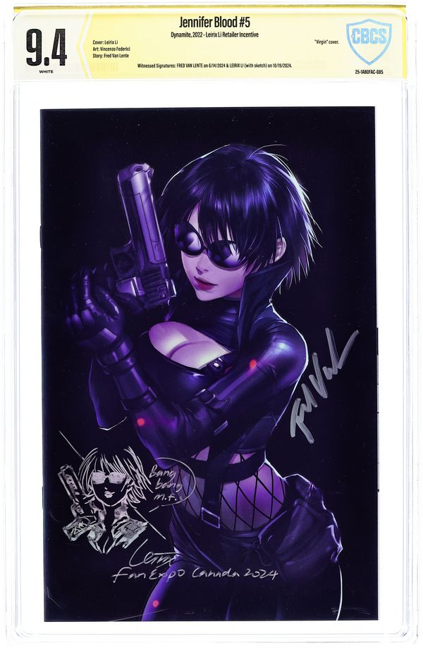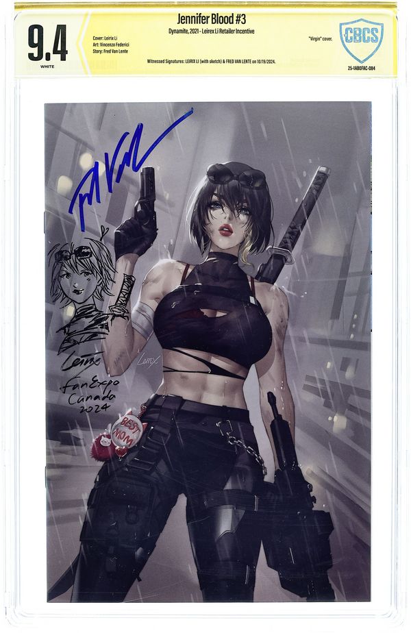 Limited 1 for 25 Retailer Incentive Variant Cover. Written by Fred Van Lente. Art by Vincenzo Federici. Cover by Leirix Li. The bullet-ridden, body count-shattering conclusion! Sheriff Giulietta Romeo knows the real identity of Jennifer Blood--but Jennifer has turned the mob bosses of Bountiful against her, so the real question is, can she live long enough to prove it? With a final showdown imminent that neither Jennifer nor Giulietta may survive, we can make you only one guarantee about this issue: There will be Blood! By FRED VAN LENTE (Wolverine) and VINCENZO FEDERICI (Red Sonja)! 32 pages, full color. Mature Readers Cover price $3.99.