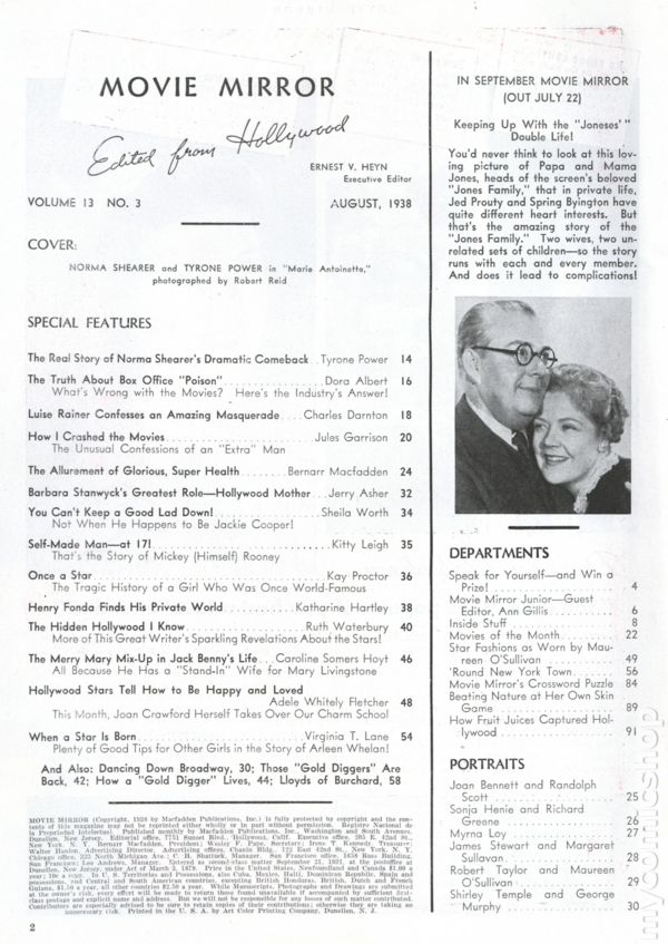 Volume 13, Issue 3 - August, 1938. Tyrone Power and Norma Shearer from the film "Marie Antoinette" on cover. This issues features include; "You Can't Keep a Young Lad Down" with Jackie Cooper, "Self-made Man" the story of Mickey Rooney in his own words, "Hollywood Stars Tell How to be Happy and Loved" with Joan Crawford, and much more. Softcover Magazine, 8.5" x 11", 66 pages, B&W. Cover price $0.10.