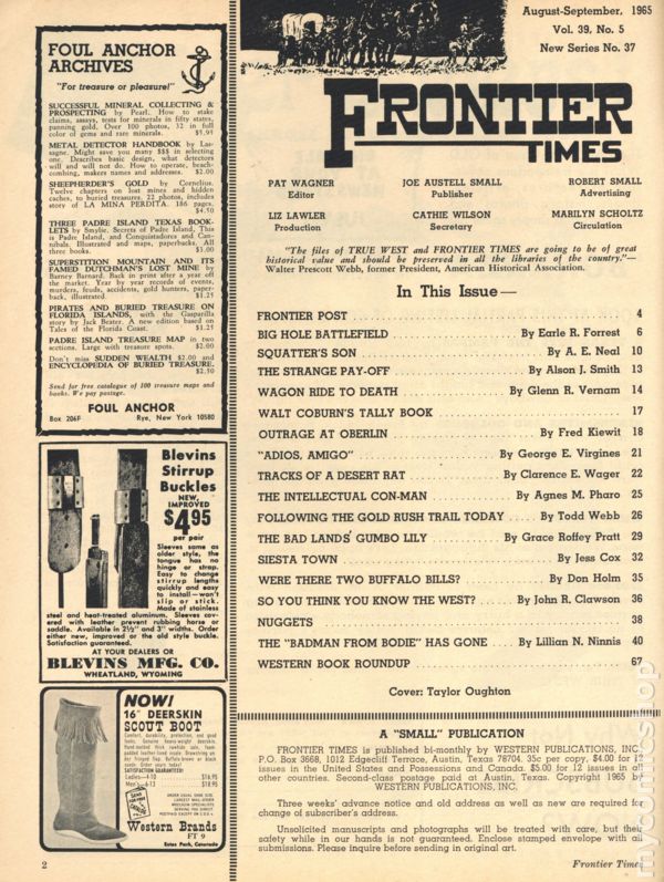 Magazine of true stories of the American Frontier. Features illustrations and photos of the old west. B&W text. Color cover. 8 1/2-in. x 11-in. 72 pages. Cover price $0.35.