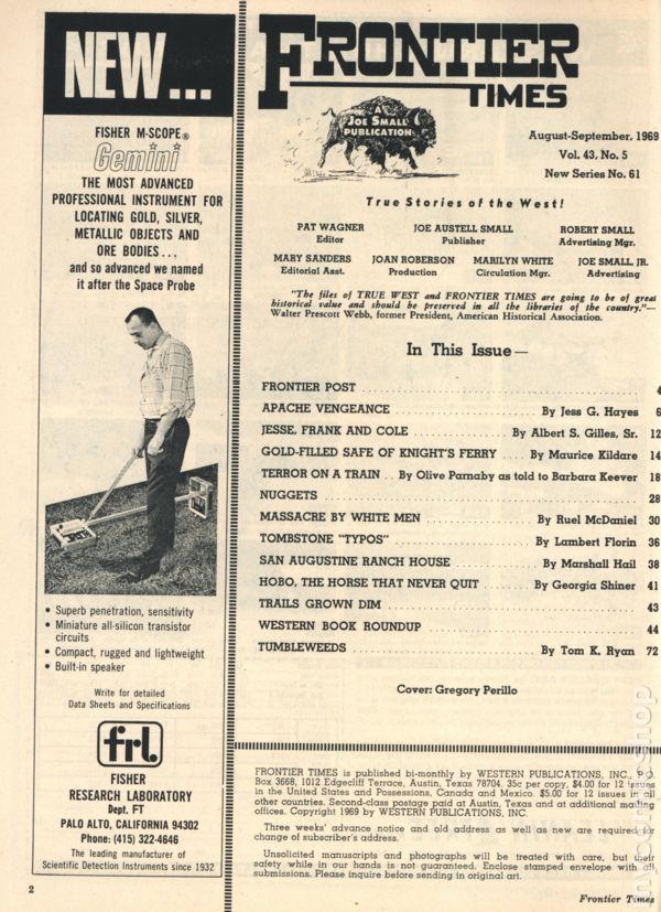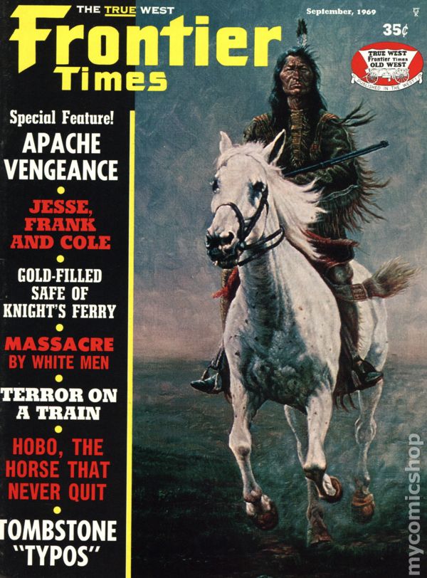 Magazine of true stories of the American Frontier. Features illustrations and photos of the old west. B&W text. Color cover. 8 1/2-in. x 11-in. 72 pages. Cover price $0.35.