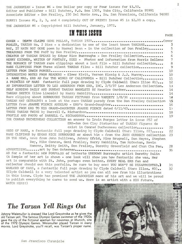Issue #6 - Jan. 1972. Fanzine devoted to celebrating the works of Edgar Rice Burroughs. Treasures from the Past, newspaper clippings and ads, letter reproductions and more. 8 1/2-in. x 11-in., 24 pages, black and white.