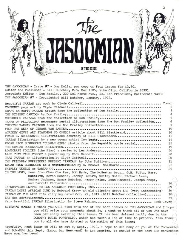 Issue #7 - Jan. 1972. Fanzine devoted to celebrating the works of Edgar Rice Burroughs. Cover by Clyde Caldwell, back cover by Steve Fabian. "Friendly Puppeteers Present Tarzan" by John Sullivan, newspaper clippings and more. 8 1/2-in. x 11-in., 28 pages, black and white.