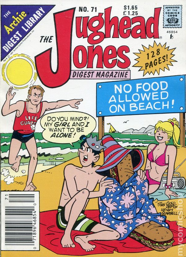 Cover art by Rex W. Lindsey. "Operation: Trick Shtick!", script by George Gladir, pencils by Rex W. Lindsey, inks by Rudy Lapick; Jughead has his dog perform a series of tricks to entertain the beach crowd—but mostly to earn some food in return. "Animal Intelligence!", script by Hal Smith, pencils by Rex W. Lindsey, inks by Jon D'Agostino; Reggie bets Jughead he can't teach Hot Dog a trick. "How to Control Your Dreams!", script by Rod Ollerenshaw and Rex W. Lindsey, pencils by Rex W. Lindsey, inks by Jon D'Agostino; Jughead explains to the reader how to control their dreams. "The Hustle!", script by George Gladir, art by Rex W. Lindsey; Reggie has been hustling his friends at tennis but Jughead evens the score. 36 pgs., full color. Cover price $1.00.