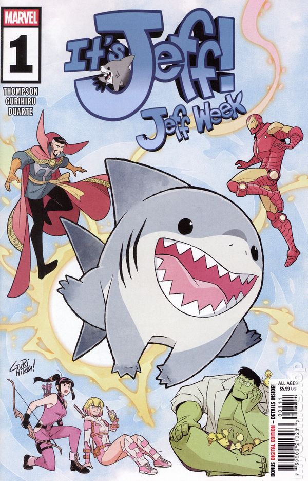 Written by Kelly Thompson and Gurihiru. Art by Gustavo Duarte. Cover by Gurihiru. WREAKING HAVOC ON LAND AND SEA…IT’S JEFF! Follow everyone’s favorite land shark as he spreads his charming chaos across the Marvel Universe! For the first time in print, you can read issues #25-36 of Kelly Thompson and Gurihiru’s original IT’S JEFF infinity comic, plus five delightful tales from Gustavo Duarte’s JEFF WEEK! Jeff tags along for some adventures with fan-favorites like the X-Men, Spider-Man, Hulk, and many more! But don’t underestimate this little shark – his adorable antics may cause more of a comm-ocean than these heroes can handle… COLLECTING: It’s Jeff Infinity Comic (2021) #25-36, Jeff Week Infinity Comic (2024) #1-5. 48 pages, full color. All Ages. Cover price $5.99.