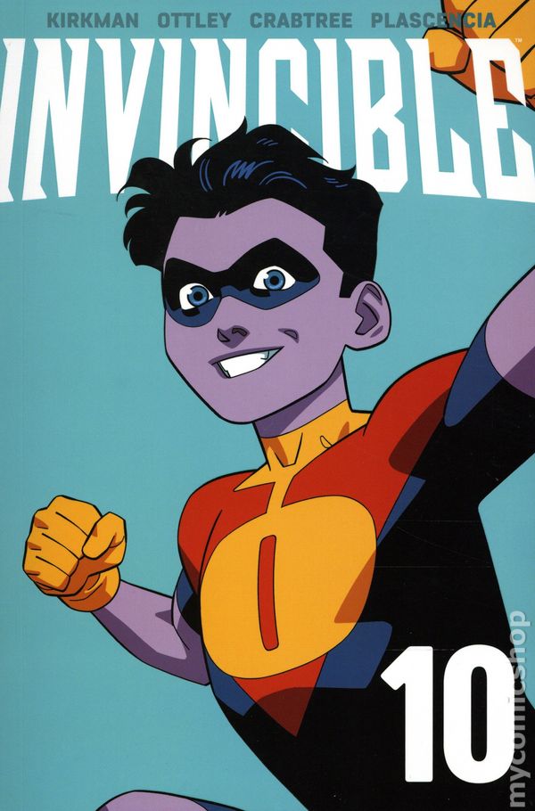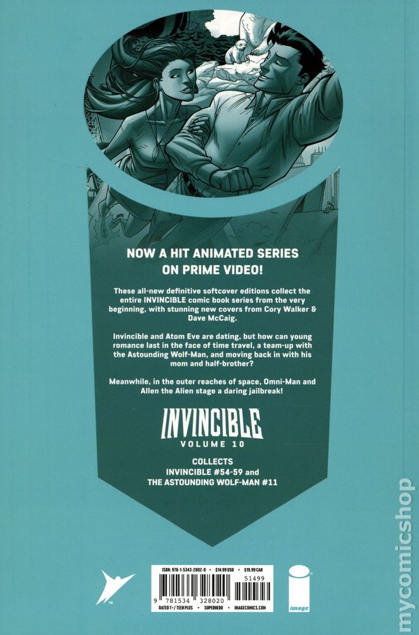 2nd Edition - Volume 10 - 1st printing. Collects Invincible (2003) #54-59 and The Astounding Wolf-Man (2007-2010) #11. Written by Robert Kirkman. Art by Ryan Ottley, Cliff Rathburn, and Jason Howard. Cover by Cory Walker. NOW A HIT ANIMATED SERIES ON PRIME VIDEO! These all-new definitive softcover editions collect the entire **INVINCIBLE **comic book series from the very beginning, with stunning covers from CORY WALKER and DAVE McCAIG. Invincible and Atom Eve are dating, but how can young romance last in the face of time travel, a team-up with the Astounding Wolf-Man, and moving back in with his mom and half-brother? Meanwhile, in the outer reaches of space, Omni-Man and Allen the Alien stage a daring jailbreak! Softcover, 160 pages, full color. Cover price $14.99.