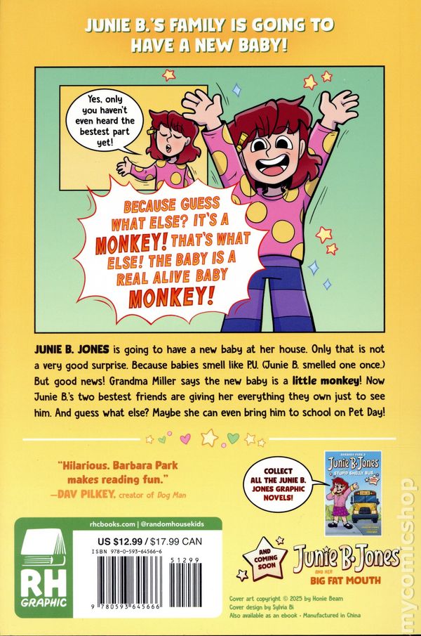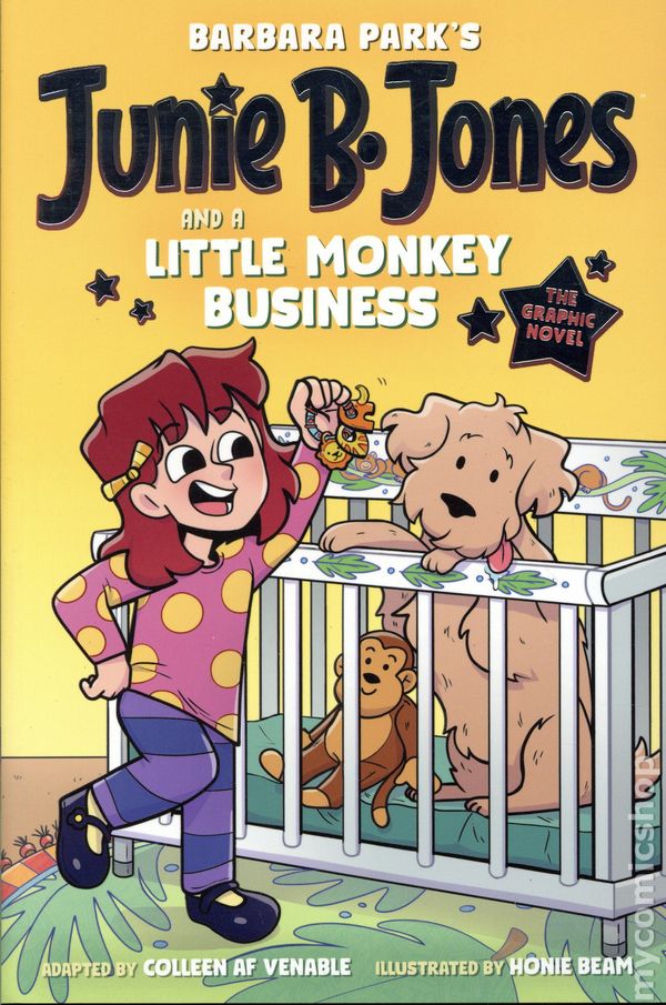 Volume 2 - 1st printing. "Junie B. Jones and a Little Monkey Business!" Based on the Story by Barbara Park. Adapted by Colleen AF Venable. Art and cover by Honie Beam. Laugh out loud with the #1 New York Times bestselling Junie B. Jones series—now in graphic novels! Junie B. is NOT happy about a new baby in the family—until her grandma tells her he's the cutest little monkey ever. A monkey brother? Now that's exciting! Junie B. Jones is going to have a new baby at her house. Only that is not a very good surprise. Because babies smell like P.U. (Junie B. smelled one once). But good news! Grandma Miller tells Junie B. the new baby is a little monkey! Now Junie B.'s two bestest friends are giving her everything they own just to see him. And guess what else? Maybe she can bring him to school on Pet Day! With over 75 MILLION books sold and more than 30 years as a beloved favorite, Junie B. is coming to graphic novels with fun, full color adaptations that gives kids even more ways to laugh—and read—with Junie B. Jones! Softcover, 6-in.x 9-in., 160 pages, full color. All Ages NOTE: Hilarious. Barbara Park makes reading fun. —Dav Pilkey, creator of Dog Man Cover price $12.99.