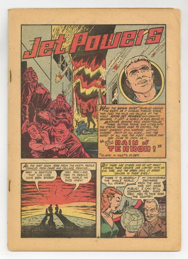 Art by Bob Powell, Wally Wood and Al Williamson. Cover by Bob Powell. Sometimes listed as A1 Comics (1944 Life's Romances) #39. Science hero Jet Powers uses advanced tech to battle supervillains, in sci-fi stories that have gained a cult following for their Bob Powell art. In the aftermath of the Dust Doom from issue #3, humankind is prey to greedy opportunists and their napalm attacks; A pilot shot down over Korea discovers that he cannot be killed; Space Ace is lured into a trap on Titan by Flor, queen of the space pirates, in a story with art by EC legends Al Williamson and Wally Wood. Cool space-battle cover by Bob Powell. The Rain of Terror!; The First Man in History Who Could Not Die!; Space Ace: Death in Deep Space!; The Fleets of Fear! 36 pages, Full Color. Cover price $0.10.