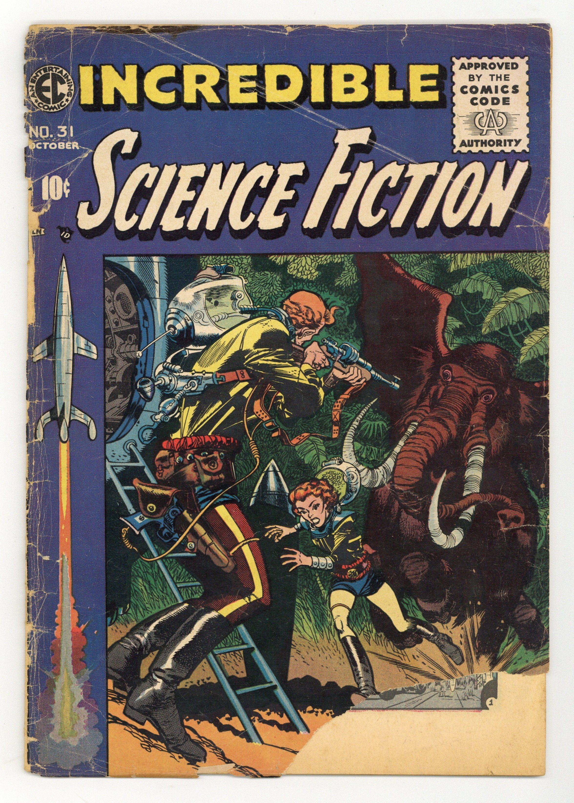 Cover by Jack Davis. Stories by Jack Oleck. Art by Bernie Krigstein, Wally Wood, Al Williamson, and Roy G. Krenkel. EC Comics changes its pioneering sci-fi title Weird Science-Fantasy to the Code-approved Incredible Science Fiction. Space tourists stranded on a primitive planet are unknowingly worshipped as gods, with art by Bernie Krigstein. A scientist finds that his time travel is predetermined to go wrong. A classic Wally Wood story reveals the age limit for space explorers. You, Rocket; Fulfillment; Time to Leave; Twice Told Tale; Has-Been. 36 pages, Full Color. Cover price $0.10.