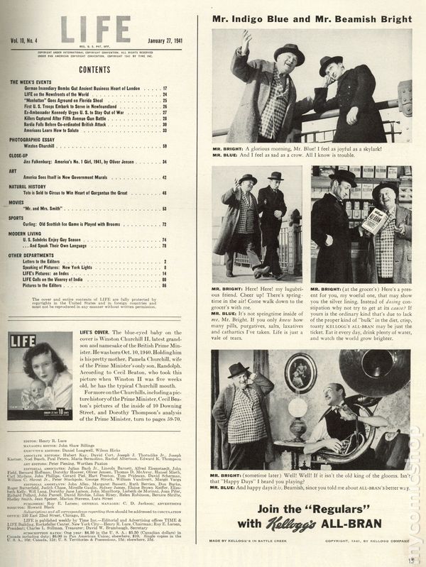January 27, 1941. Classic weekly news/photo magazine. In this issue: Winston Churchill photographic essay; government murals; curling; Jinx Falkenburg; and more. 10.5-in. x 13.75-in.; partial color; 88 pages. Cover price $0.10.