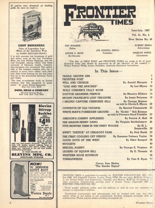 Magazine of true stories of the American Frontier. Features illustrations and photos of the old west. B&W text. Color cover. 8 1/2-in. x 11-in. 72 pages. Cover price $0.35.