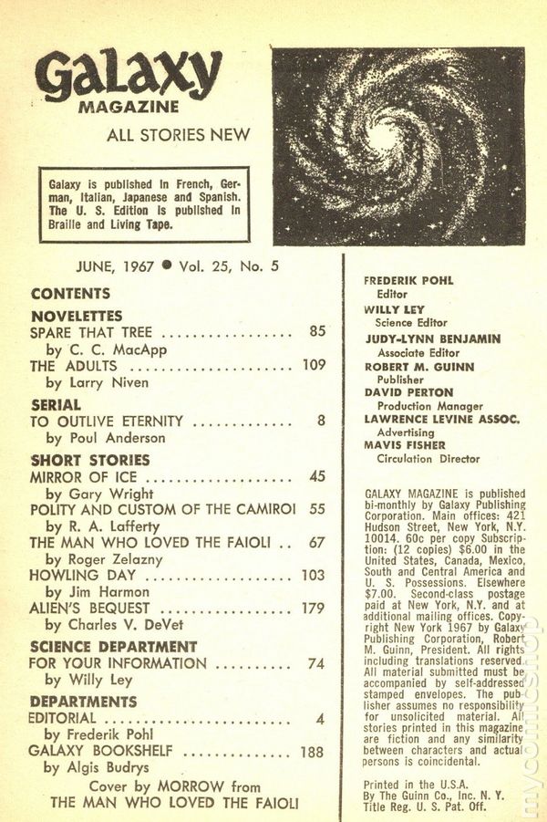 June 1967. Cover by Morrow. Stories: "Spare That Tree" by C. C. MacApp, "The Adults" by Larry Niven, "To Outlive Eternity"(Part 1) by Poul Anderson, "Mirror of Ice" by Gary Wright, "Polity and Custom of the Camiroi" by R. A. Lafferty, "The Man Who Loved the Faioli" by Roger Zelazny, "Howling Day" by Jim Harmon, and "Alien's Bequest" by Charles V. DeVet. 5.25-in. x 7.5-in.; 194 Pages, B&W. Cover price $0.60.