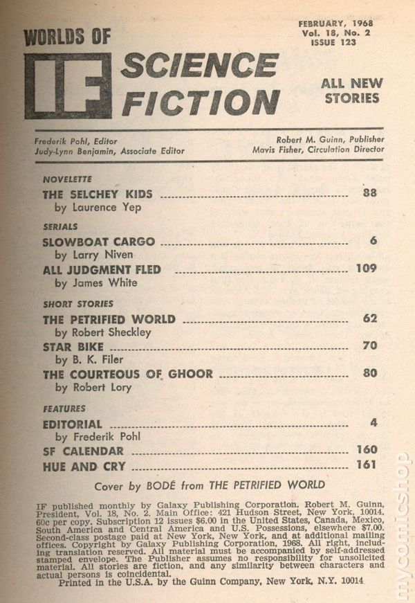 February 1968. Cover by Vaughn Bode. Science fiction stories by Laurence Yep, Larry Niven, James White, Robert Sheckley, B. K. Filer, Robert Lory. Illustrations by Dan Adkins, Jack Gaughan, Gray Morrow. 5.25-in. x 7.5-in.; 162 Pages, B&W Cover price $0.60.