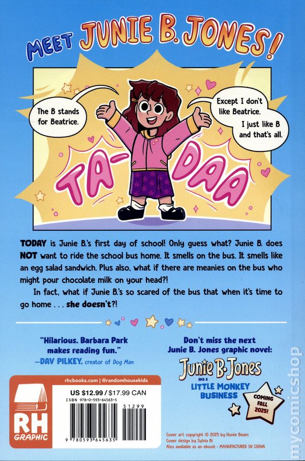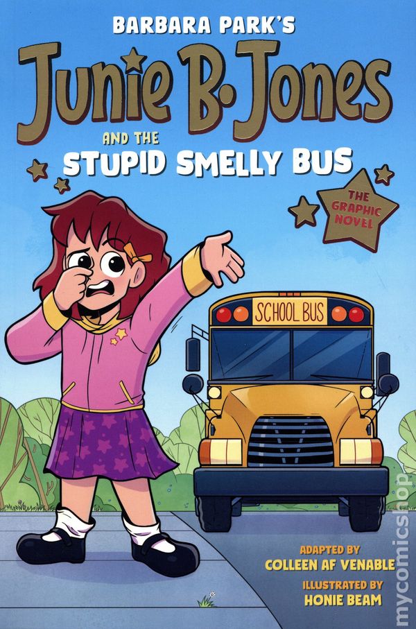 Volume 1 - 1st printing. "Junie B. Jones and the Stupid Smelly Bus!" Based on the Story by Barbara Park. Adapted by Colleen AF Venable. Art and cover by Honie Beam. Meet the teacher day? Check! Fun, new classroom? Check! Shiny new first day of school shoes? Check! Meet Junie B. Jones! The B stands for Beatrice. Except she doesn't like Beatrice. She just likes B. and that's all. Junie B. is almost six. Almost six is when you go to kindergarten. And today is Junie B.'s first day of school! Only guess what? Junie B. does not want to ride the school bus home. It smells on the bus. Plus also, what if there are meanies on the bus who might pour chocolate milk on your head?! In fact, what if Junie B.'s so scared of the bus that when it's time to go home... she doesn't?! Hardcover, 6-in.x 9-in., 160 pages, full color. All Ages Cover price $23.99.