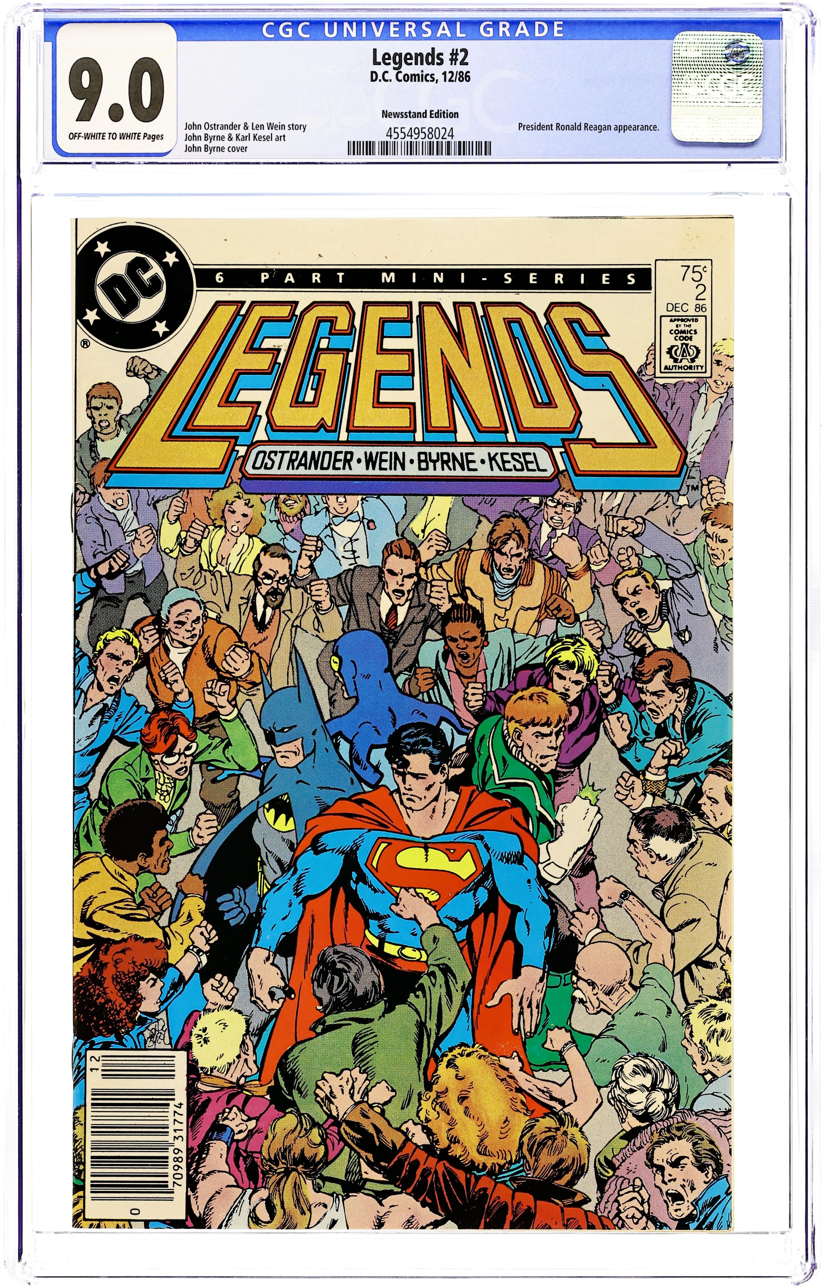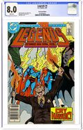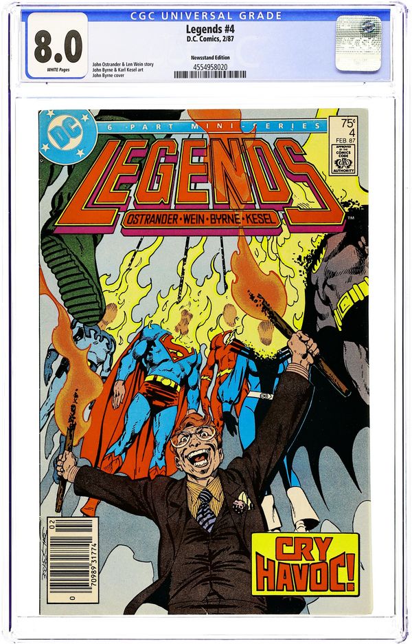 Newsstand Edition. Legends Chapter 8. Darkseid continues Operation Humilation, which is an attempt to rid Earth of its legendary costumed heroes. Brimstone is on the rampage, G. Gordon Godfrey continues spreading his message of ill will, and President Ronald Reagan orders super-heroes to cease all activities. Plotted by John Ostrander and scripted by Len Wein, with pencils by John Byrne and inks by Karl Kesel. Cover price $0.75.
