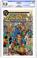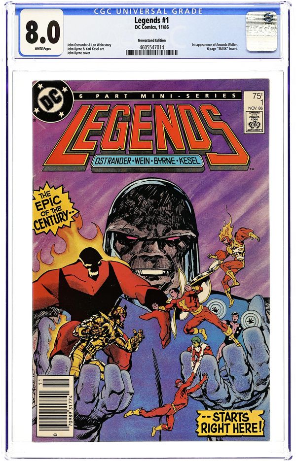 Newsstand Edition. Includes Mask comic insert. Darkseid once again reigns supreme on Apokolips, but the legendary super-heroes of Earth remain a thorn in his side. Thus, he begins Operation Humiliation. Firestorm battles Brimstone, Flash takes on Deadshot, and Captain Marvel (in his first post-Crisis appearance) fights Macro-Man. Legends is designed to kick off three new ongoing series (The Flash, Suicide Squad, and The Justice League) and a mini series (Shazam: A New Beginning). Plotted by John Ostrander and scripted by Lein Wein, with pencils by John Byrne and inks by Karl Kesel. Cover price $0.75.