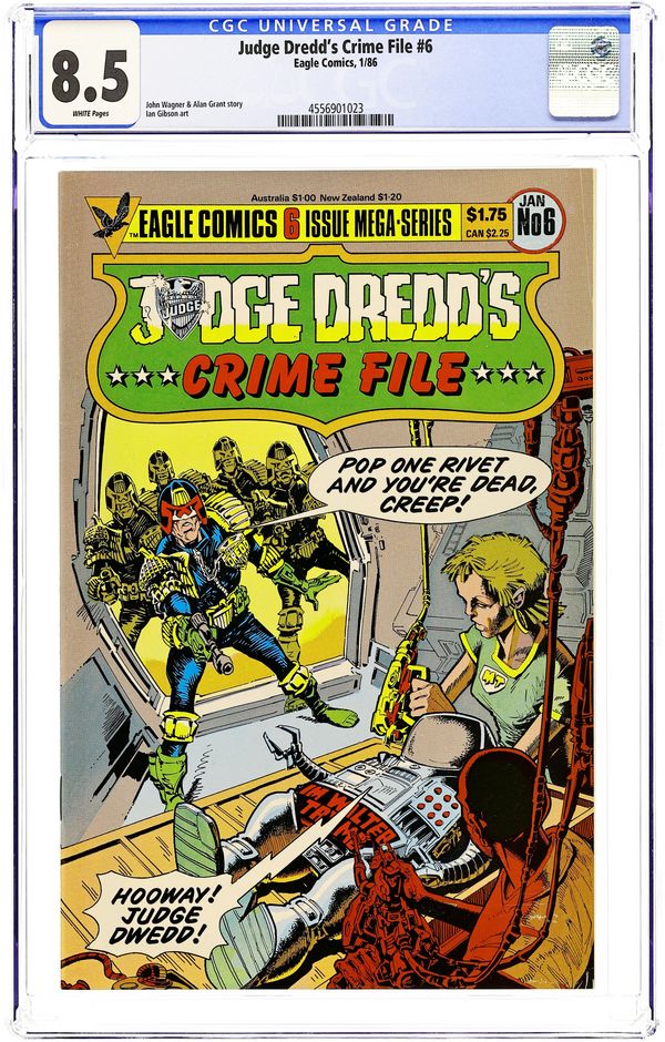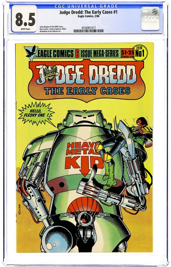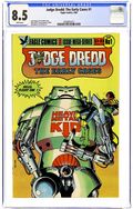 Cover art by Brian Bolland. "The Robot Wars," script by John Wagner, art by Ron Turner (p. 1-5, 11-15, 21-25), Carlos Ezquerra (p. 6-10), Mike McMahon (p. 16-20) and Ian Gibson (p. 25-29); At the 'Robot of the Year Show', Judge Dredd stops a wheelchair-bound maniac who will kill hundreds. Reprinted from 2000 AD. 36 pgs., full color. Cover price $1.25.