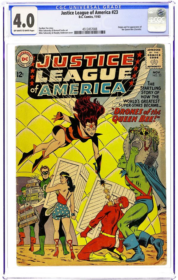 Cover pencils by Mike Sekowsky, inks by Murphy Anderson. Drones of the Queen Bee!, script by Gardner Fox, pencils by Mike Sekowsky, inks by Bernard Sachs; The Queen Bee blackmails the JLA into securing the elements she needs for an immortality potion, but even though they fulfill their end of the bargain, they prevent her from her ultimate goal. 36 pgs. $0.12. Cover price $0.12.