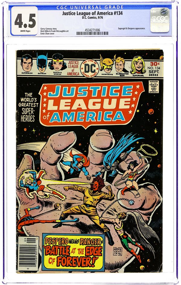 Cover art by Ernie Chan. The Battle at the Edge of Forever!, script by Gerry Conway, pencils by Dick Dillin, inks by Frank McLaughlin; Albon and Nordon, survivors of a doomed alien race, pit the League and Despero against one another; Supergirl tricks the aliens; Superman is revived and brought back to Earth. 36 pgs. $0.30. Cover price $0.30.
