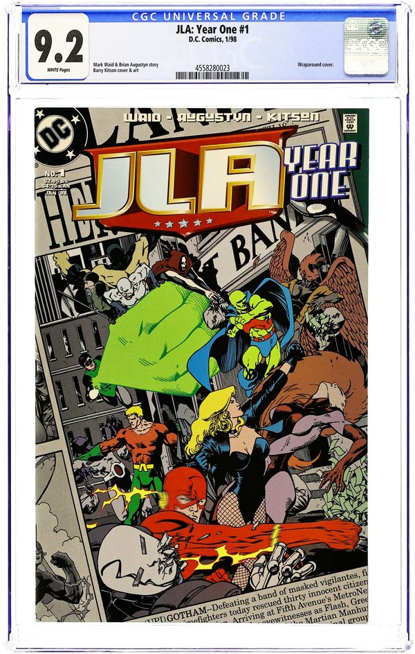 Written by: Mark Waid and Brian Augustyn Pencils by: Barry Kitson. Justice League of America: Year One A fun series that focuses primarily on the interplay of the personalities of the League members. After individually defeating a different alien threat, known collectively as the Appellax, Martian Manhunter, Green Lantern (Hal Jordan), Flash (Barry Allen), Black Canary (Dinah Lance), and Aquaman each consider the potentials of forming and working as a team. While meeting to confront the final Appellax, Black Canary teaches Barry some techniques from the Golden Age Flash, while Green Lantern, Martian Manhunter, and Aquaman realize the power of their combined strength and ability to compensate for each other's weakness. Meanwhile Locus, the militarized group connected to the Appellax, also realizes the ramifications of facing a unified team of heroes. *Note: This series expands upon the post-Crisis origin of the Justice League established in Secret Origins 32. Due to Post-crisis continuity changes that excluded Wonder Woman from being a founding member, Black Canary became the original female member of the team. Cover price $2.95.