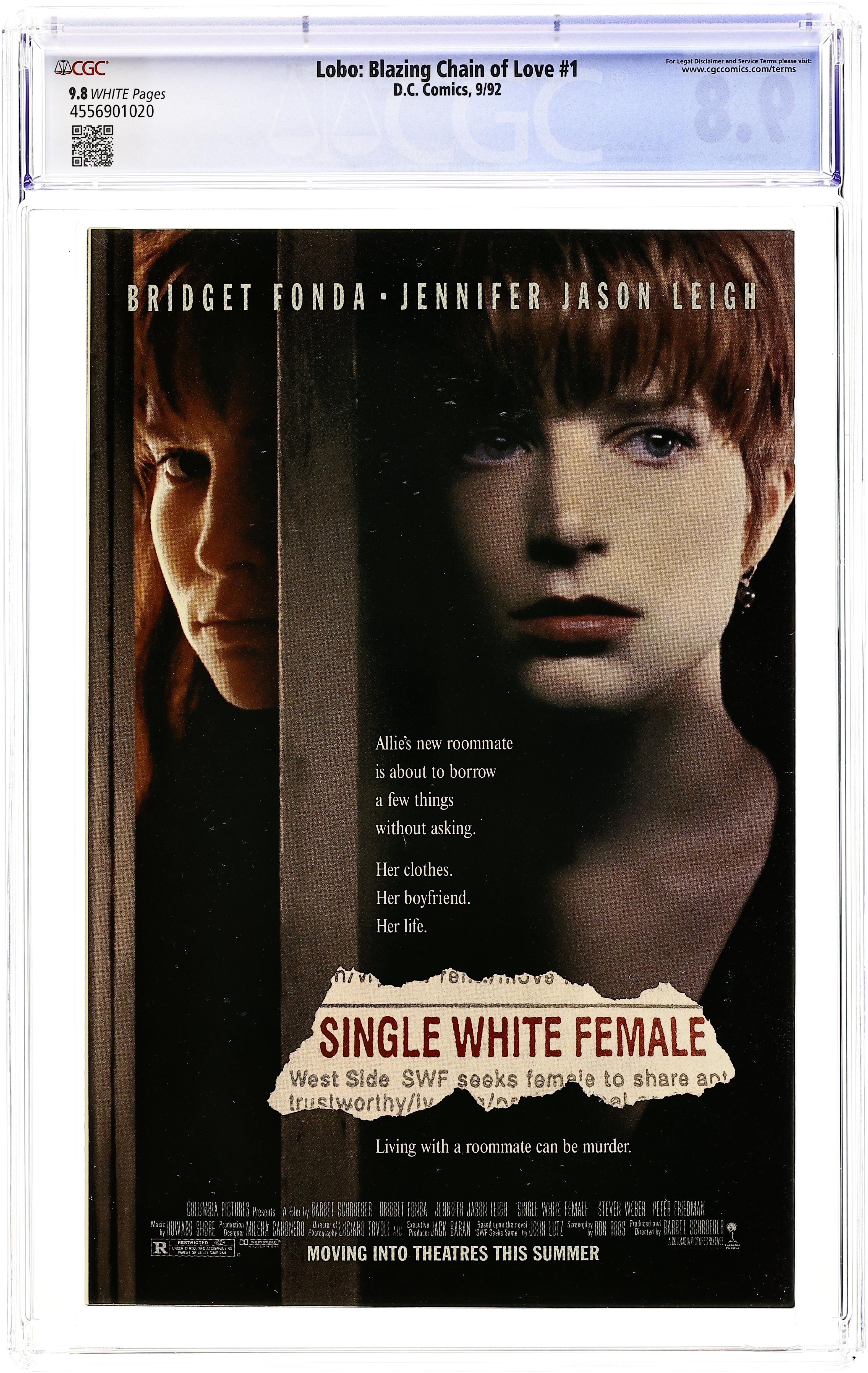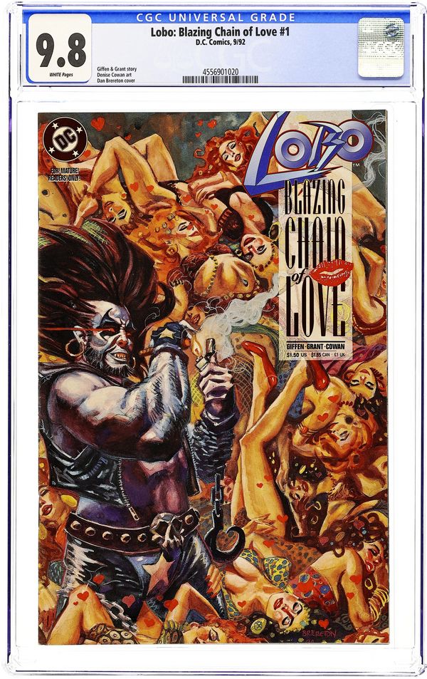 So, okay, BLAZING CHAIN OF LOVE pushes the boundaries of humorous adventure (and - sigh - love!) as only a bastich like Lobo can as the main man's working once again for Ramona, the hairdresser/skip tracer. This time he's on the trail of a beautiful murderess who's hiding in the harem of Sultan Algor...a harem the size of New Jersey full of very lovely - and lonely - ladies. But lonely enough to settle for the likes of Lobo? Will Lobo survive the bounty of feminine wiles? Will he still find his bounty? Who knows? YOU will, if you buy this comic. Written by Keith Giffen and Alan Grant, with art by Denys Cowan. Painted cover by Dan Brereton. New Format. Suggested for Mature Readers. Cover price $1.50.