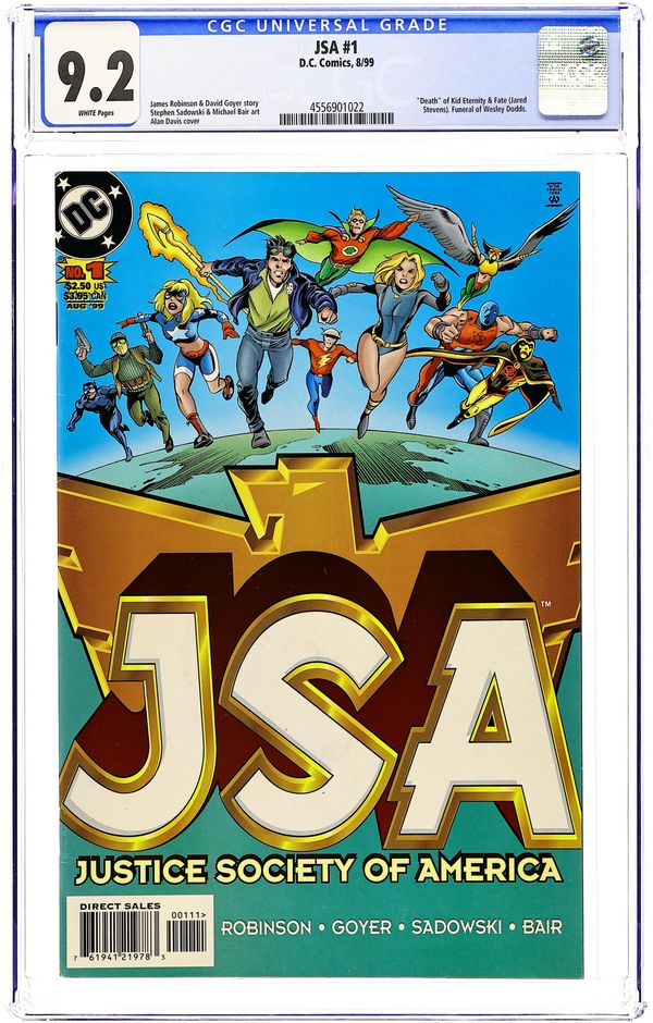 WRITTEN BY DAVID S. GOYER AND GEOFF JOHNS; ART BY SAL VELLUTO AND BOB ALMOND; COVER BY JOHN CASSADAY An all-star group of creators tackles the JSA past and present! This 8-issue miniseries provides a perfect introduction to the rich world of the JSA! The entire team is in jeopardy, and only by going off on their own can they tackle the enemy within their midst! For more information, see the feature article. FC, 32 PG. (1 OF 8) $2.50 Cover price $2.50.