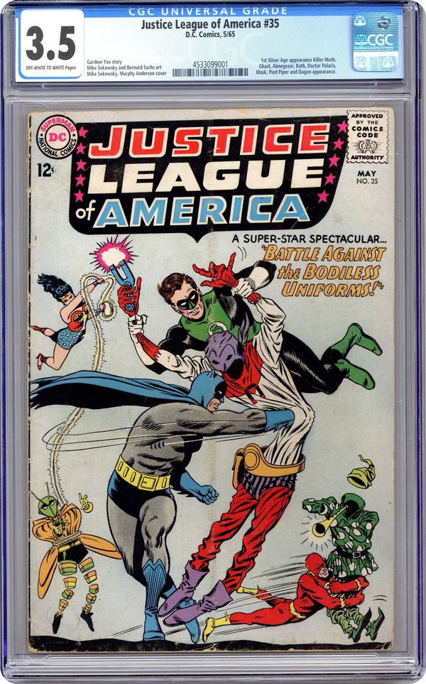 Cover pencils by Mike Sekowsky, inks by Murphy Anderson. Battle Against the Bodiless Uniforms, script by Gardner Fox, pencils by Mike Sekowsky, inks by Bernard Sachs; The Demons Three create duplicates of JLA villains in an effort to get the JLA to release them from their imprisonment. Rocky and Bullwinkle star in a one-page Cheerios ad. 36 pgs. $0.12. Cover price $0.12.