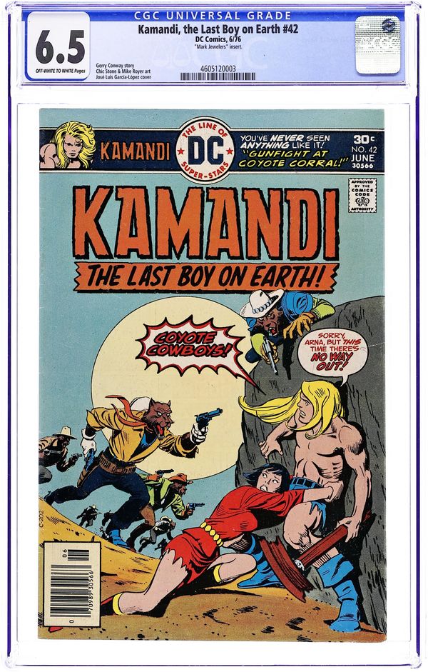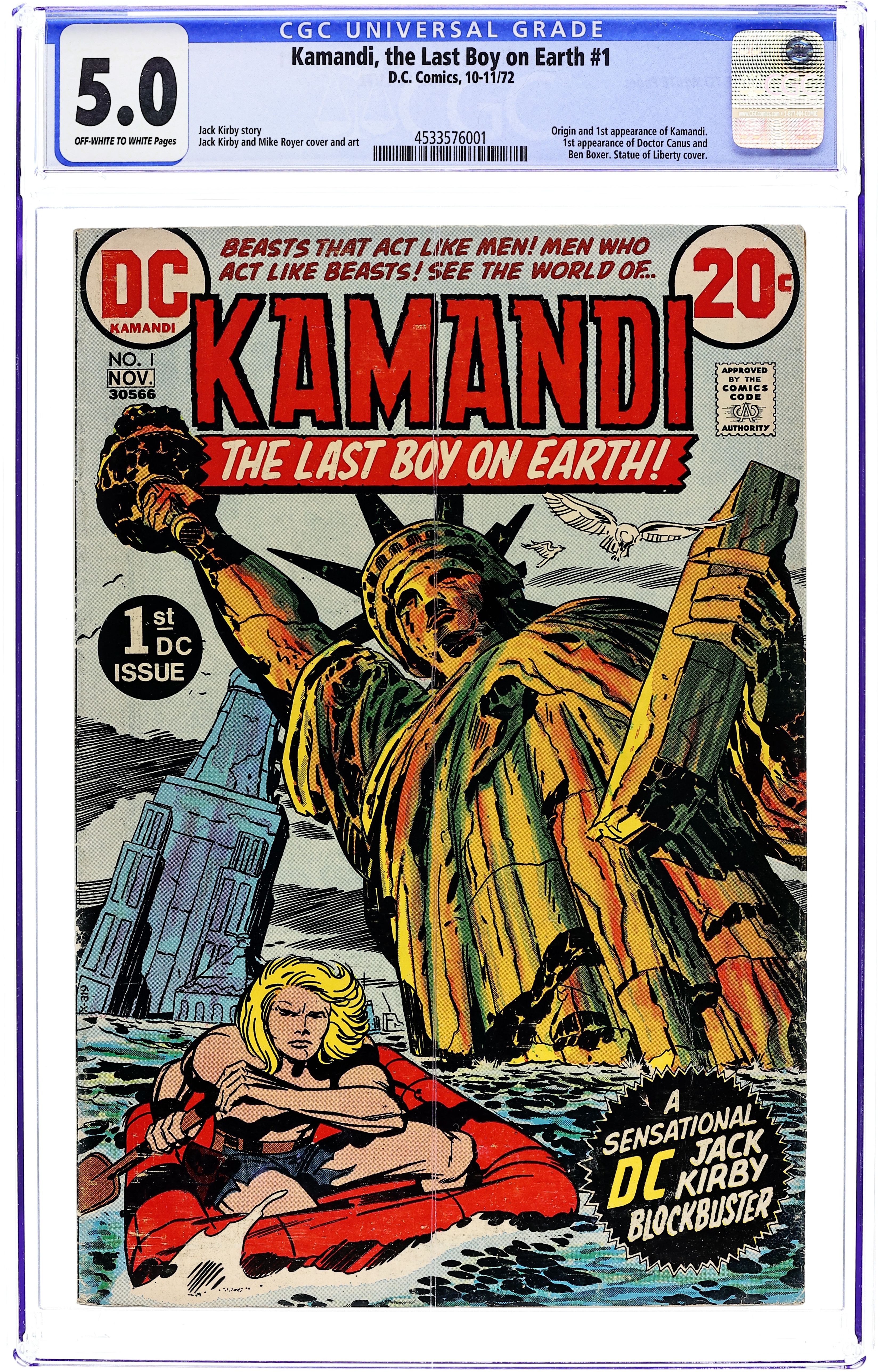 1st appearance and origin of Kamandi. "The Last Boy on Earth." Script and pencils by Jack Kirby, inks by Mike Royer. Cover by Kirby and Royer. A series that borrows many concepts from Planet of the Apes, Kamandi takes place in an alternate future where animals have mutated into bipedal beings of intelligence and where humans are treated like savage beasts. Kamandi avenges the death of his grandfather, who was killed by wolves, but is then captured by a tiger named Caesar, who turns him over to dog-scientist Dr. Canus. Canus proceeds to help Kamandi, and this is where the so-called last boy on earth hooks up with Ben Boxer, a mutated human who can turn to living metal. Cover price $0.20.